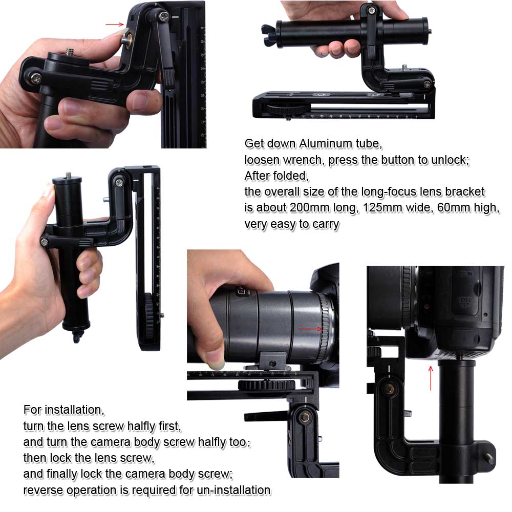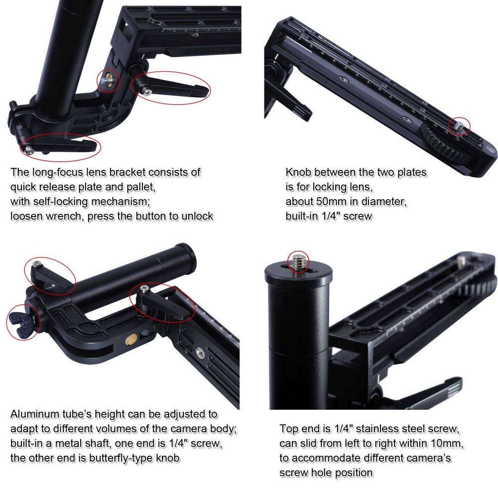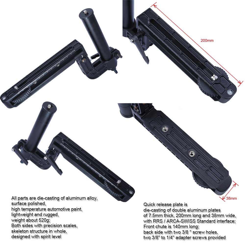1. All parts are die-casting of aluminum alloy, surface polishing, high temperature automotive paint, lightweight and rugged, weight about 520g; 2. Quick release plate is die-casting of double aluminum plates of 7.5mm thick, 200mm long and 38mm wide, with RRS / ARCA-SWISS Standard interface; 3. Knob between the two plates is for locking lens, about 50mm in diameter, built-in 1/4" screw; 4. Pallet is die-casting of double aluminum plates of 8mm thick, built-in self-locking device; joints are adjusted by wrench; 5. Aluminum tube’s height can be adjusted to adapt to different volumes of the camera body; built-in a metal shaft, one end is 1/4" screw, and the other end is butterfly-type knob; 6. Quick release plate is RRS / ARCA-SWISS standard fit, compatible with RRS / ARCA-SWISS / KIRK / Wimberley / MARKINS / SUNWAYFOTO / kangrinpoche / BENRO / SIRUI / MARSACE ball head and clamp of AS standard, suitable for iShoot IS-JZ30 / IS-JZ50 / IS-JZ64 / IS-QJ58 / IS-QJ64 / IS-JZ60BK etc. |