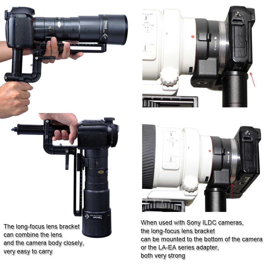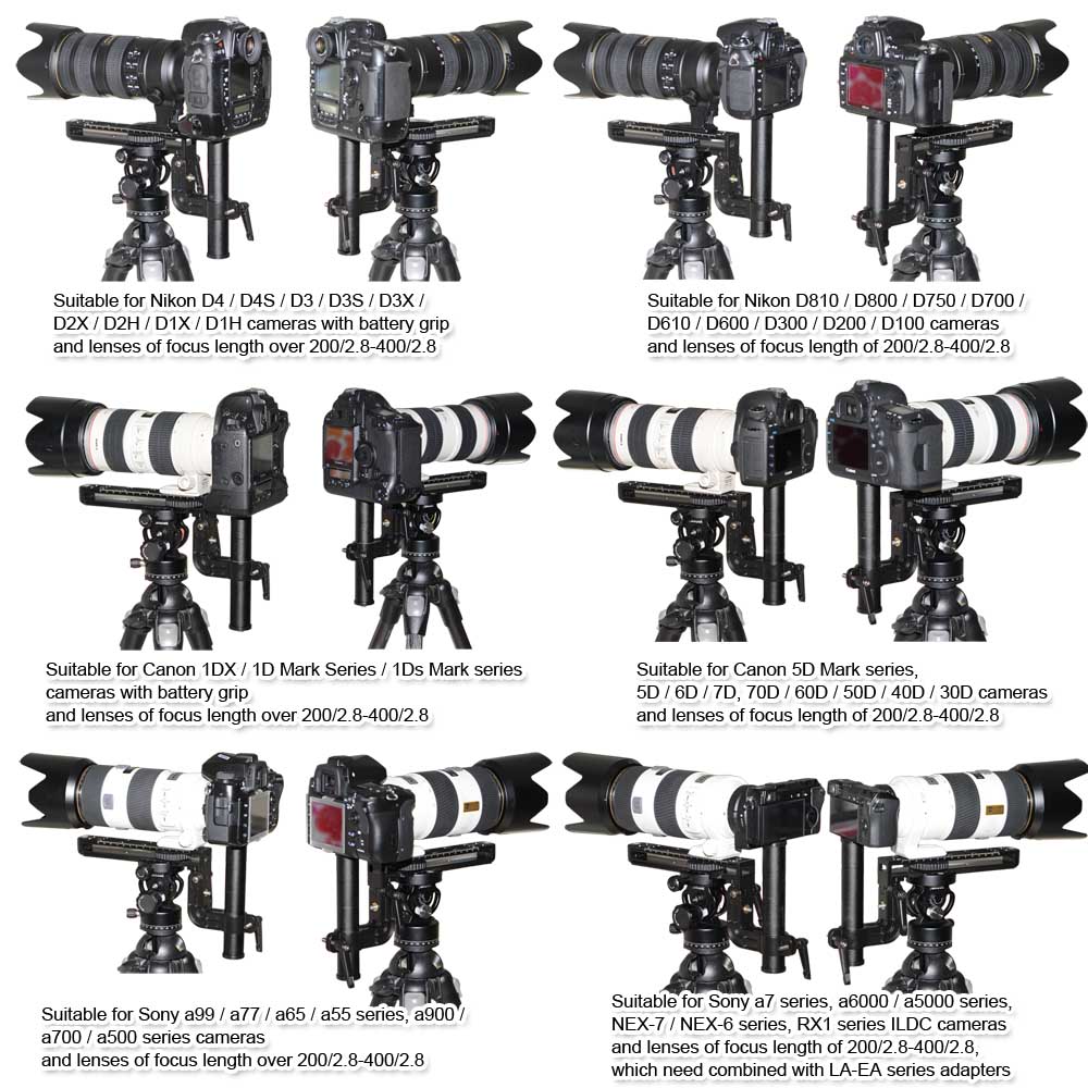 Nikon D4 / D4S / D3 / D3S / D3X / D2X / D2H / D1X / D1H cameras with battery grip and lenses of focus length over 200/2.8-400/2.8; Nikon D810 / D800 / D750 / D700 / D610 / D600, D300 / D200 / D100 cameras and lenses of focus length of 200/2.8-400/2.8; Canon 1DX / 1D Mark Series / 1Ds Mark series cameras with battery grip and lenses of focus length over 200/2.8-400/2.8; Canon 5D Mark series, 5D / 6D / 7D, 70D / 60D / 50D / 40D / 30D cameras and lenses of focus length of 200/2.8-400/2.8; Sony a99 / a77 / a65 / a55 series, a900 / a700 / a500 series cameras and lenses of focus length over 200/2.8-400/2.8; Sony a7 series, a6000 / a5000 series, NEX-7 / NEX-6 series, RX1 series ILDC cameras and lenses of focus length of 200/2.8-400/2.8, which need combined with LA-EA series adapters. |