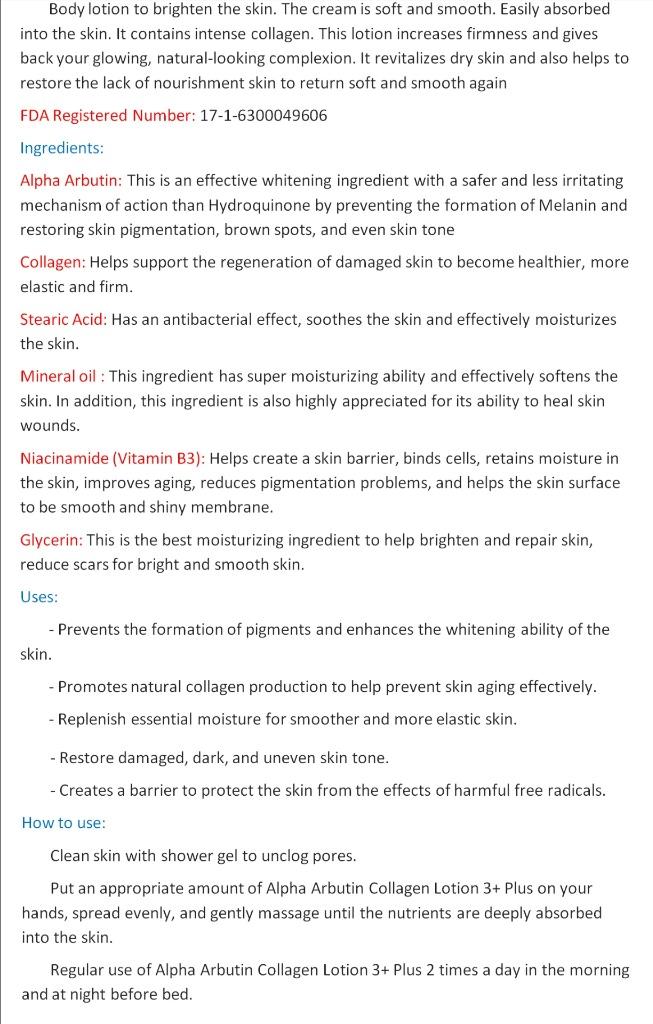 | | | 500ml. Alpha Arbutin Collagen body Lotion Deep Bright Essence Soft Smooth | Shipping Details: - The item will be shipped worldwide next business day after the money has been transferred to my Paypal account and you should received in 2-4 weeks. The item will be posted by airmail from Thailand in well package and send by Non-Registered airmail.
