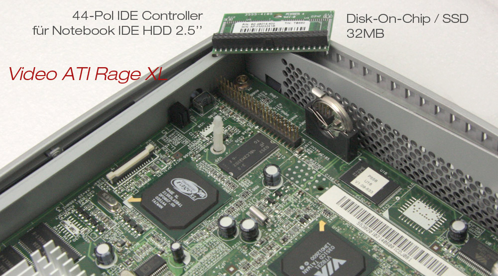 USB, 10/100 network card, CPU via 533MHz, 64MB RAM, 32 MB hard drive on SSD base, an Ide Controller with a 44-pin connection is available. Further connections: 4x USB ports, 10/100 network card, video VGA 15-pin.