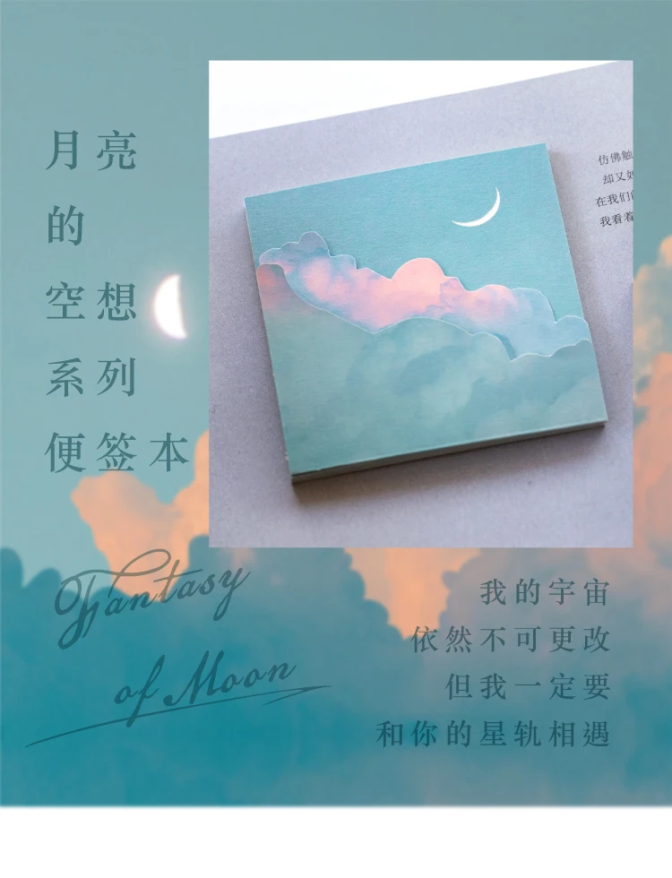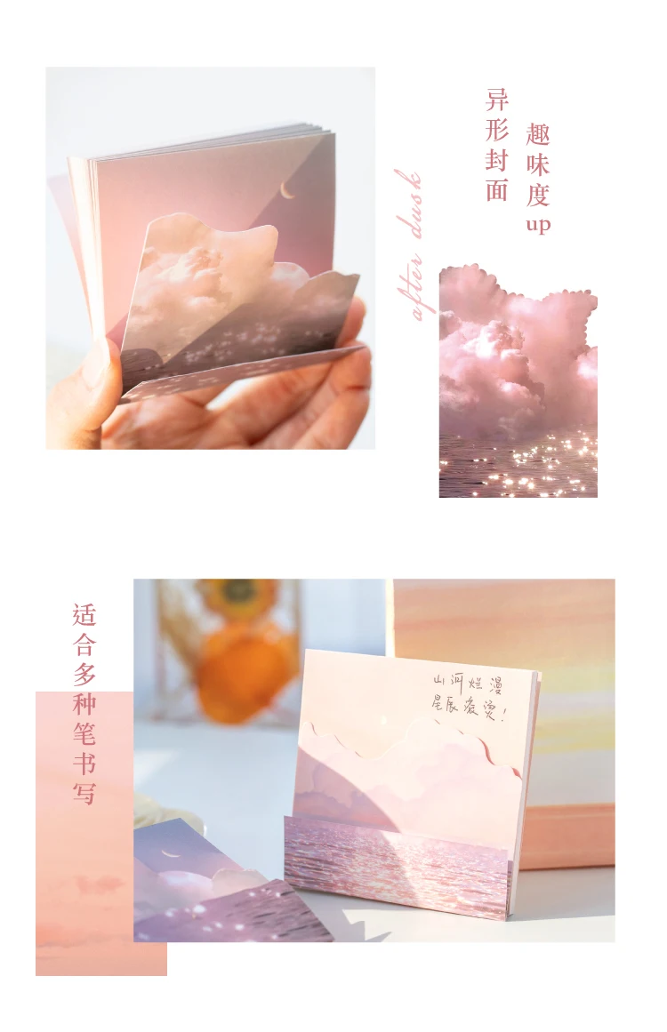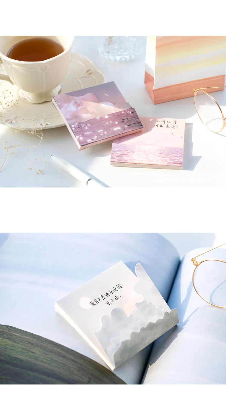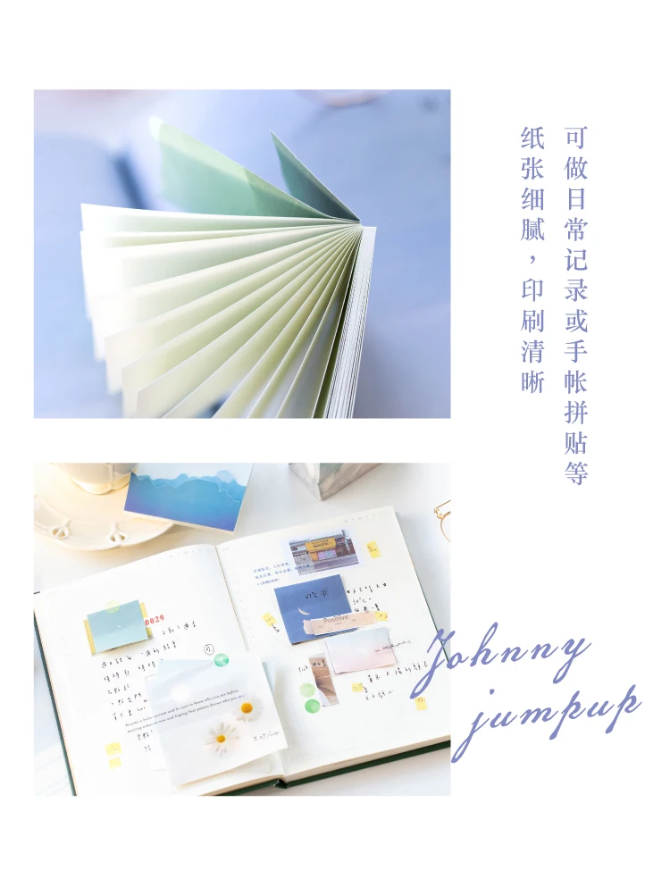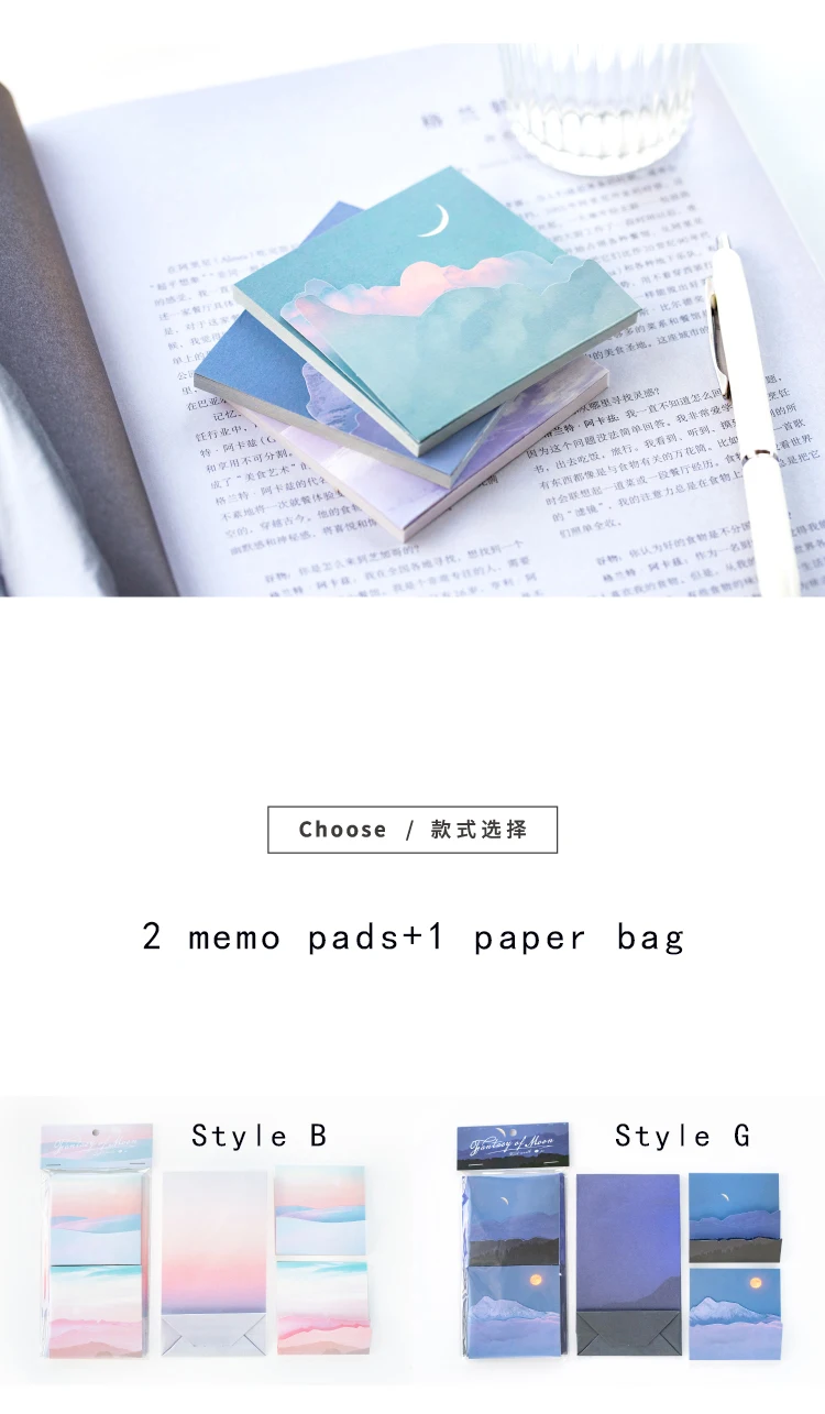 Material:paper Style:8 designs Quantity:2 memo pads+1 bag 40pcs/book x 2pcs Size: memo pads size:77x77mm paper bag size:90x154x40mm Weight:65g