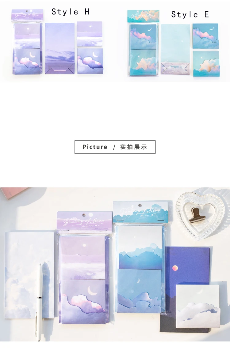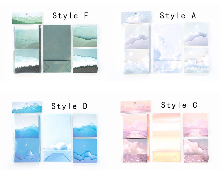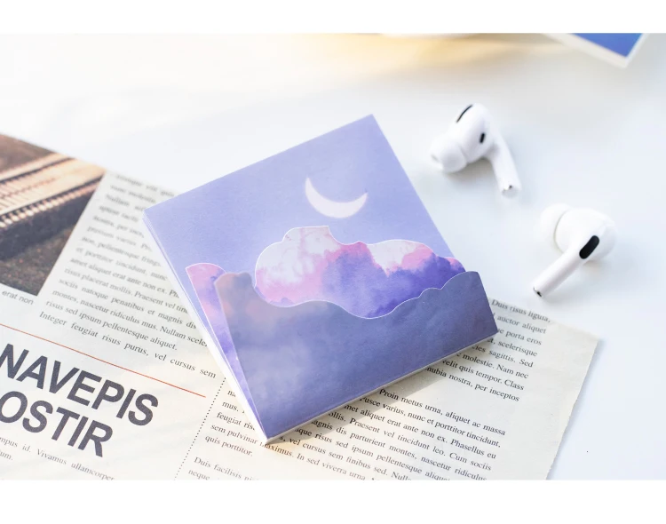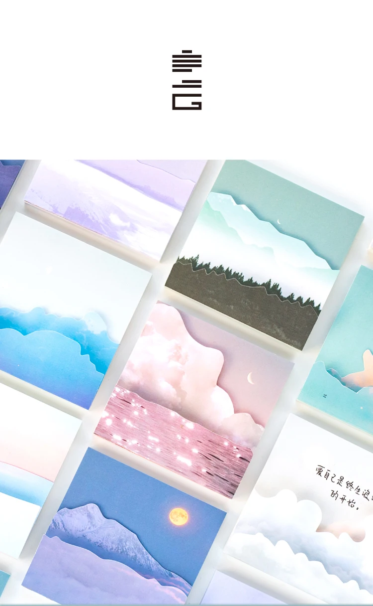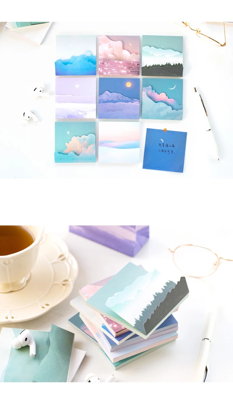 Material:paper Style:8 designs Quantity:2 memo pads+1 bag 40pcs/book x 2pcs Size: memo pads size:77x77mm paper bag size:90x154x40mm Weight:65g