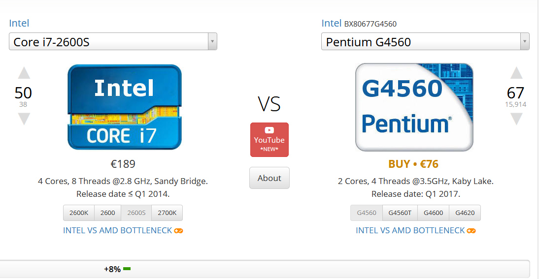 Der Vergleich mit einem älteren i7 ist nicht ganz korrekt; CPUs i5 oder i7 sind Prozessoren für die private Nutzung und supporten keine ECC Speichermodule; Der Prozessor intel G4650 supportet ECC schon und das ist das Wichtigste, wenn man ein zuverlässigen Betrieb eines Computers erwartet. Übrigens: Das Board supportet auch eine Reihe von den zur Zeit teueren E3 Xeon CPUs und bis 64GB ECC RAM, falls Sie diesen Computer irgendwann ausrüsten wollen.