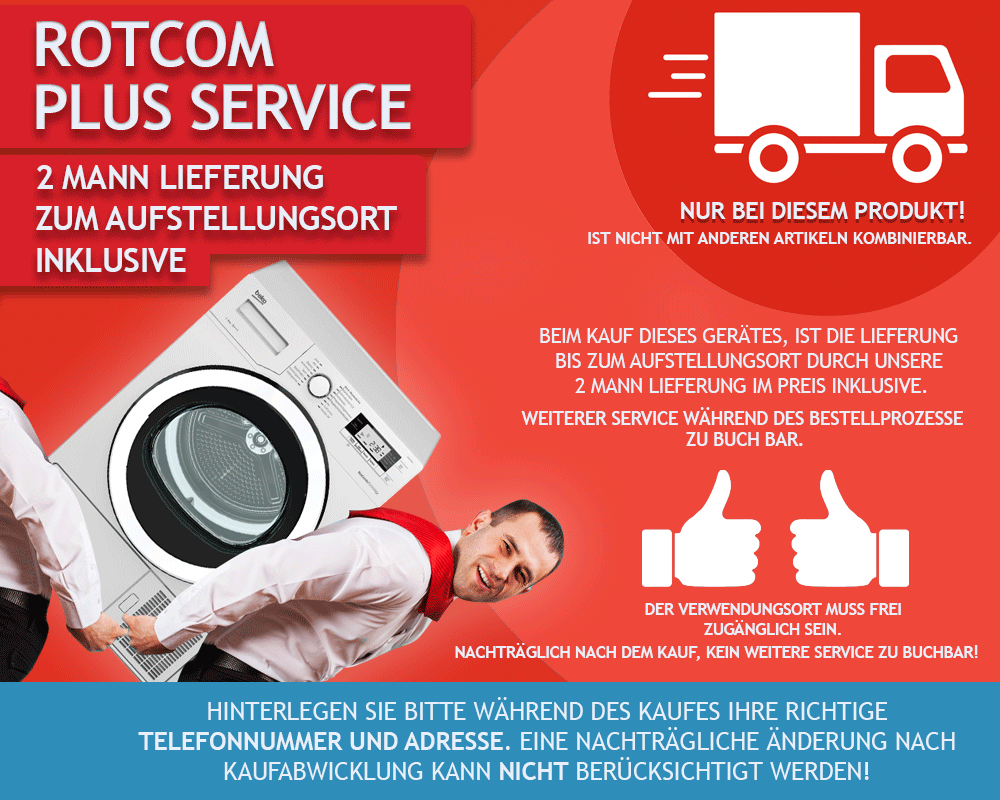 Die Lieferung erfolgt inklusive 2 Mann Lieferung bis zum Aufstellungsort (Die Ware wird nicht ausgepackt oder angeschlossen). Kann aber bei der Bestellung dazugebucht werden.