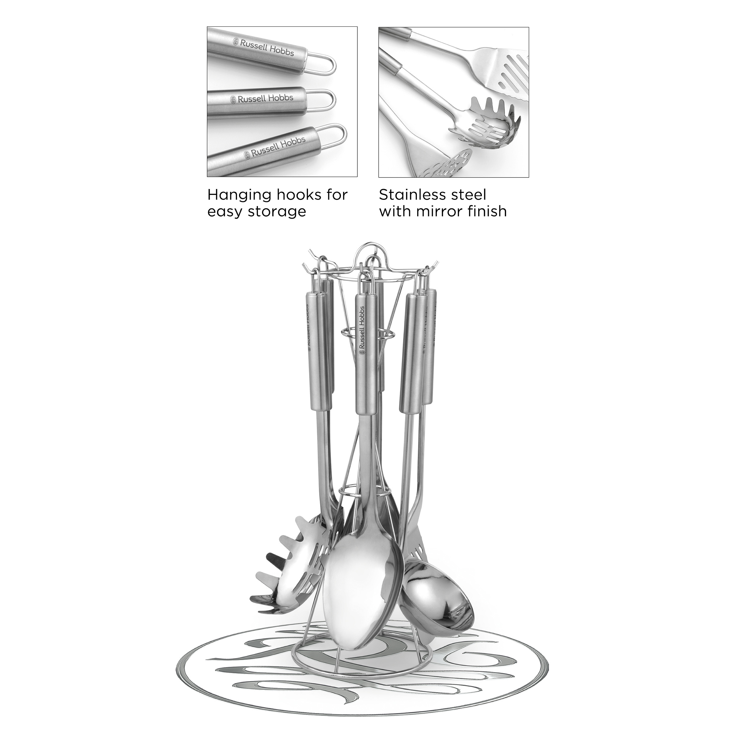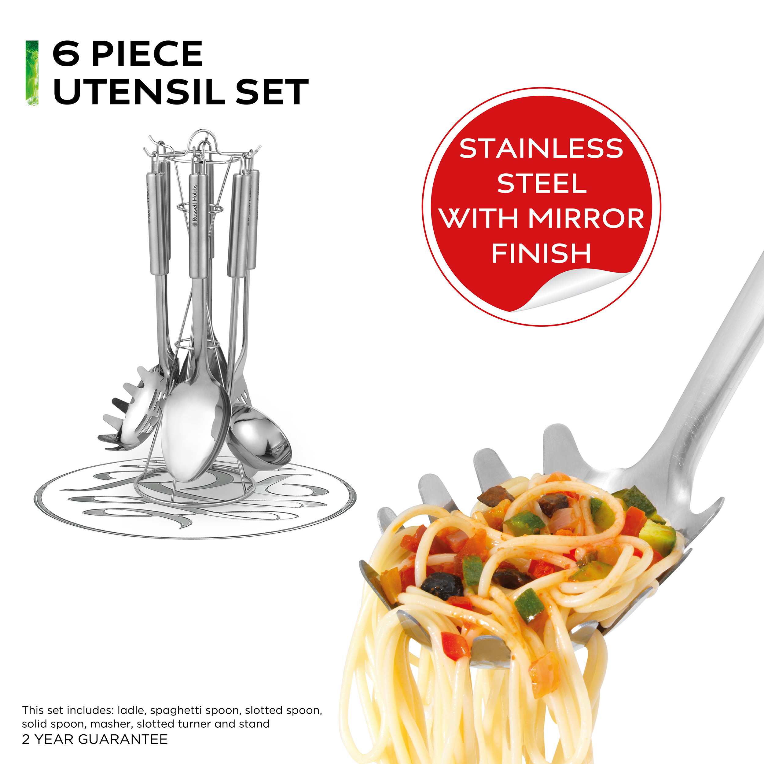 Practical and stylish, this six piece utensil set from Russell Hobbs is essential for any modern kitchen. To ensure that cooking the family favourites is simple, the kitchen tool set is complete with a range of utensils including a ladle, spaghetti spoon, slotted spoon, solid spoon, a masher and a slotted turner. Meeting your everyday needs, these stainless steel utensils boasts a mirror polished finish and will sit comfortably on your worktop, hanging from the convenient storage stand included.