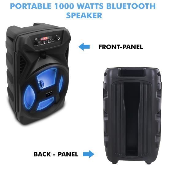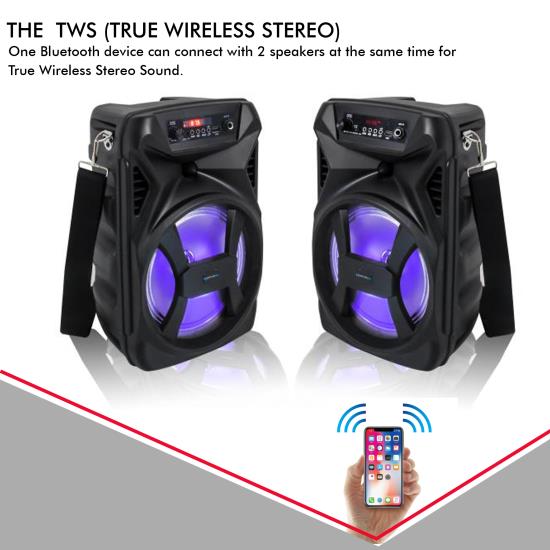 This 8 Inch Rechargeable Bluetooth LED Speaker comes with a peak power of 500 Watts. It has a built-in rechargeable battery which allows you hours of continuous music playing. The TWS (True Wireless Stereo), One Bluetooth device can connect with 2 speakers at the same time for True Wireless Stereo Sound. Bluetooth compatibility allows for wireless connection to any A2DP stereo Bluetooth device and it has Bluetooth range up to 30 ft.