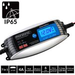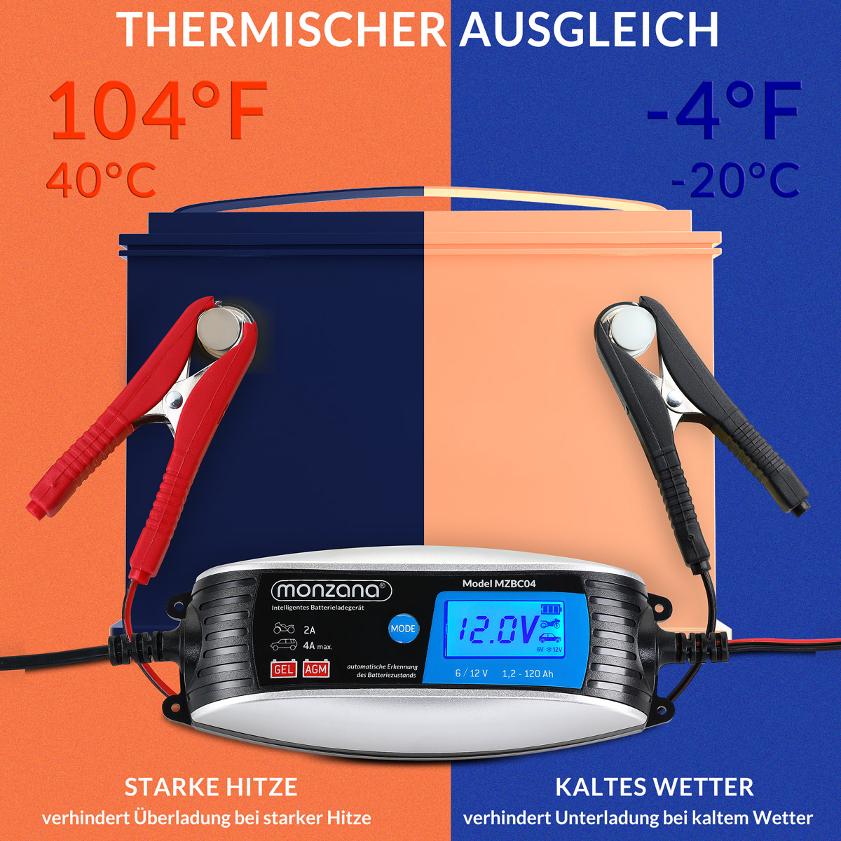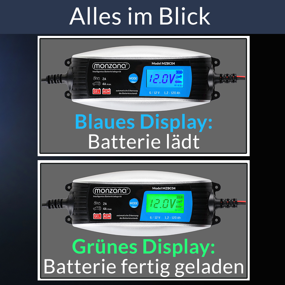 Dieses vollautomatische MZBC04 MONZANA® 7-Schritt KFZ-Batterie-Ladegrät dient zum Laden und Erhaltungsladen von 6V oder 12V Blei-Säure-Batterien mit flüssigem Elektrolyt (WET), wartungsfreien Blei-Säure-Batterien (MF), Gel-Elektrolyt (GEL) oder Elektrolyt absorbierende Matten (AGM). Mit dem blau beleuchteten LCD-Display kannst du den Ladestand jederzeit überwachen und das Display zeigt das Ende der Ladung an, indem es zu grün wechselt. Dieses ist leicht verständlich und komfortabel zu bedienen.