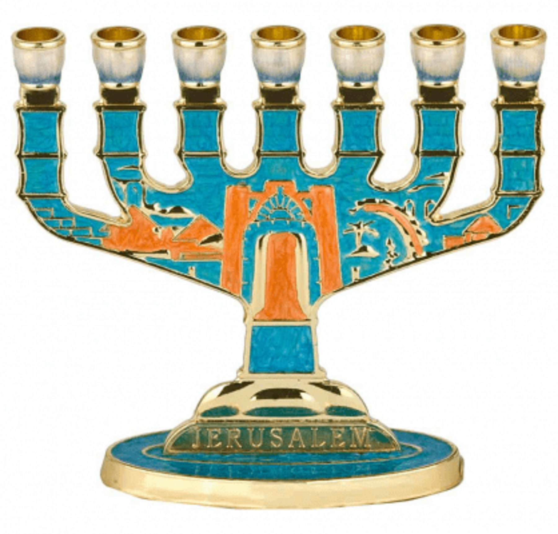 This lovely 7 branch menorah is turquoise in color with orange and golden undertones. The word, “Jerusalem,” is printed on the base in d gold. The branches are turquoise and covered in a brick print reminiscent of the Western Wall