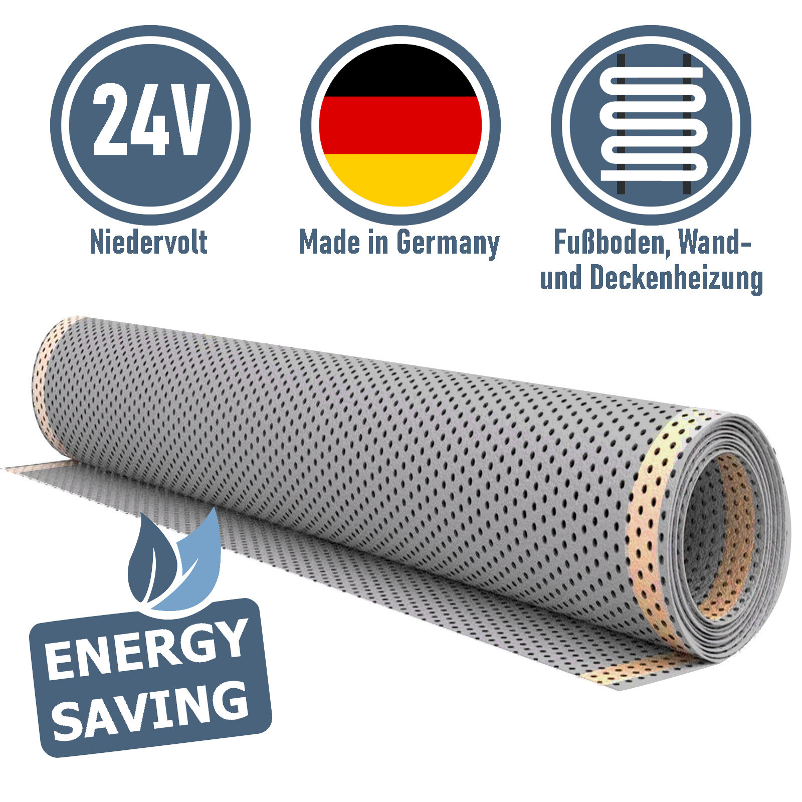 Il film di riscaldamento, definito anche film di riscaldamento in carbonio, è la variante più sottile del riscaldamento a pavimento elettrico. È costituito da due cinghie di rame che forniscono un rivestimento elettricamente conduttivo su un materiale vettore. L'area quasi intera all'interno del film di riscaldamento si riscalda uniformemente e garantisce quindi un pavimento piacevolmente caldo sulla superficie completamente posata.