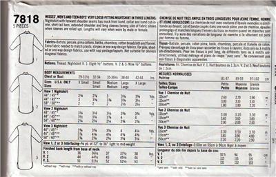 Simplicity Sewing Pattern 7818 Size XS 29 31.5 Unisex Nightshirt