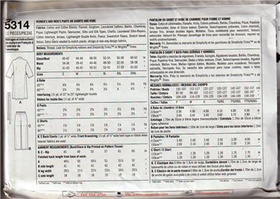 Simplicity Sewing Pattern 5314 Size 52 to 62 XL XXXL Unisex Pants Shorts Robe