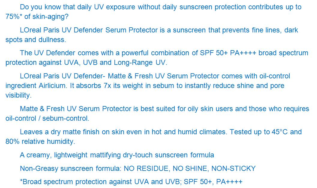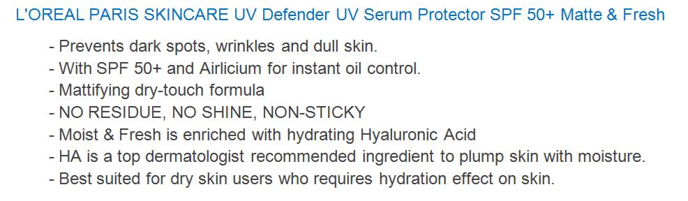 | Loreal UV Defender Serum Protector Sunscreen Matte and Fresh SPF50+ PA++++ 50ml |