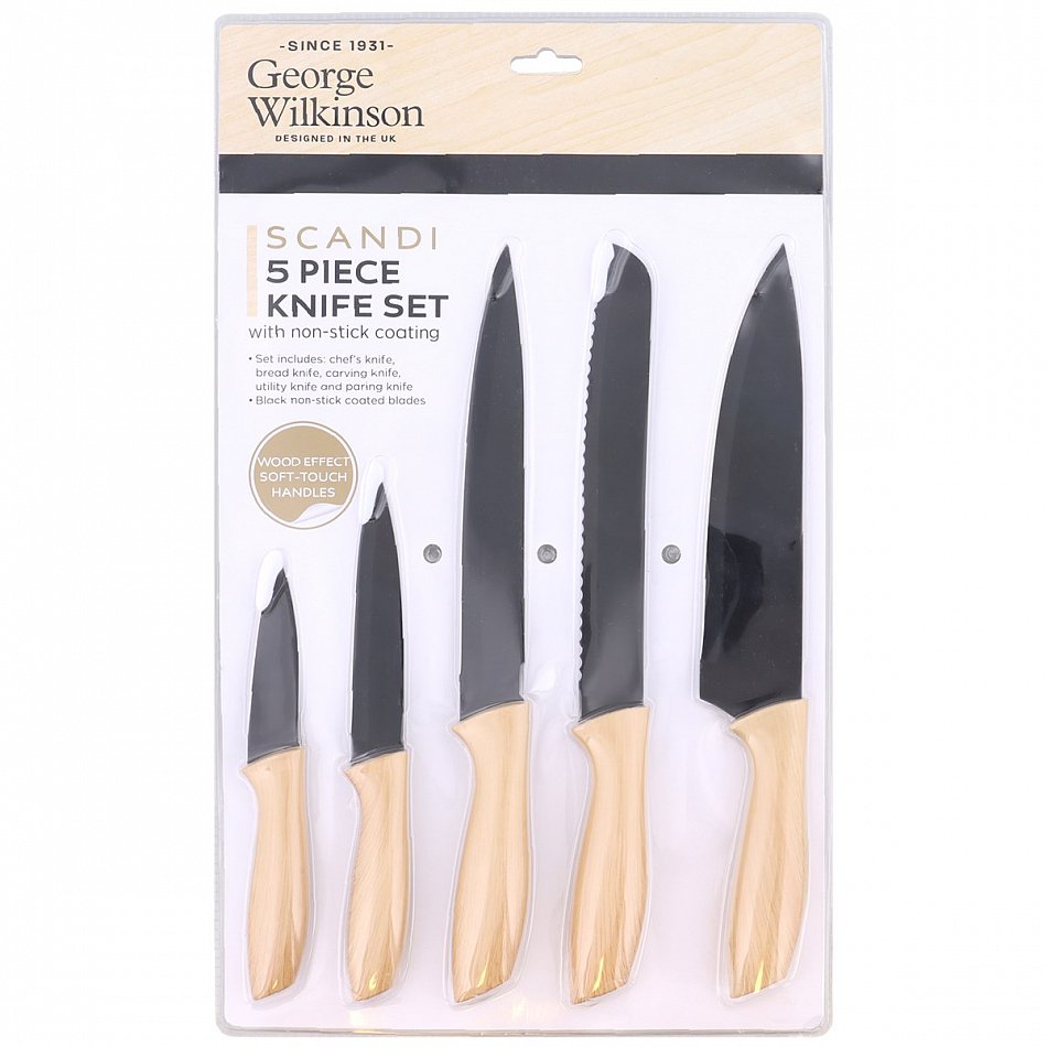 Set beinhaltet: Kochmesser, Brotmesser, Tranchiermesser, Universalmesser und Gemüsemesser. Weiche Griffe mit Holzeffekt Schwarze Klingen mit Antihaftbeschichtung Mit diesem hochwertigen Messerset können Sie sämtliche Lebensmittel ganz einfach in feine Stücke schneiden. Unentbehrlich in der Küche.