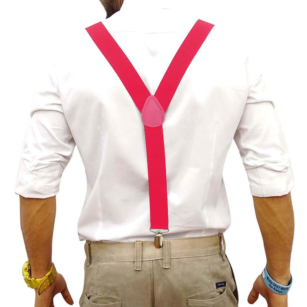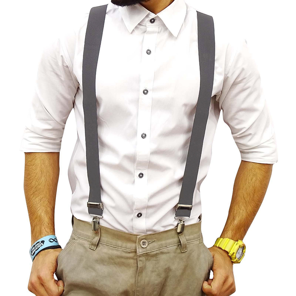 [EXCELLENT MATERIAL] Our mens suspender is made of high quality materials Spandex. Heavy duty Y-back shape design,surprise workmanship,solid hand long. These clip suspenders are comfortable and hold up trousers very well,easy to open clip, enough strength to hold your pants up tightly. Enjoy a good fit with our high quality clasps that grip on securely without unintentional unbuckling. Sturdy and durable. [UNIQUE DESIGN] This suspender has a unique,functional alternative to the classic belt. A pair of clip-on suspenders are a distinctive and versatile way to provide trouser support. With wide elastic suspenders,you can spruce up your formal wear or show off a hip,trendy new way to rock a pair of jeans or shorts. [PERFECT FOR FORMAL & CASUAL EVENTS] Ideal for Daily Wear, Parties, wedding or Fancy Dress etc. Perfect for, dance groups, school functions like band, choir, orchestra and many more special occasions and events. Great for: Trousers, Jeans, Suit, Shorts,any plain button-down shirt and trousers outfit instantly turns to formal attire! Specifications: Spandex, Hand washable fabric Style: Solid Strap design Shortest: 17inch/ 43cm Longest: 31inch/ 80cm Wide: 1inch/ 2.5cm (One size fits most) Include: 1 x Mens Suspender Color: Black/ White/ Grey/ Rose Red Note: 1. Please allow slight 1-3cm difference due to manual measurement and a little color variation for different display setting 2. Size doesn't fit all, please carefully check size chart and select the size based on your real size。 --------------------------------------------------------------------------------------------