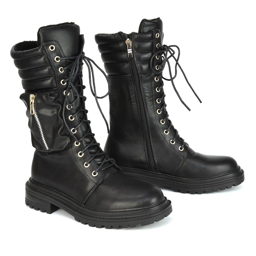Womens Black Boots Ladies Flat Lace Up Pocket Biker Combat Calf Booties Size 3-8