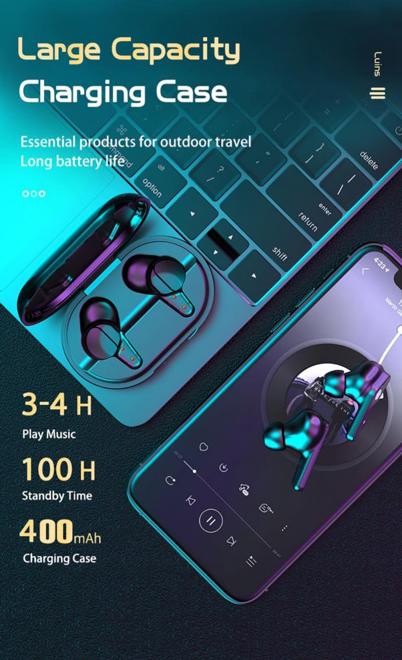 TWS Headphones Earphones Wireless Earbuds Charger Case Stereo True Wireless. HD microphones are built-in for clear and uninterrupted calls, all the unnecessary and surrounding noises will be suppressed completely through our microphones. Our earbuds are designed for extreme comfort and a secure fit. We use the ergonomically designed with gel-flexible silicone earcaps to ensure your In-Ear Headphones fit comfortably to the ears, durable for long-term usage and won't cause any skin irritation under all circumstances. Hifi Stereo Sound with no latency, suitable for all kinds type of music. Auto Pairing. Once taking out of charging case, it will enter into pairing mode automatically. Lightweight, Secure fit and comfortable with whole day usage. Sweat and splash-proof design: track air are sweat and splash-proof up to IPX4.