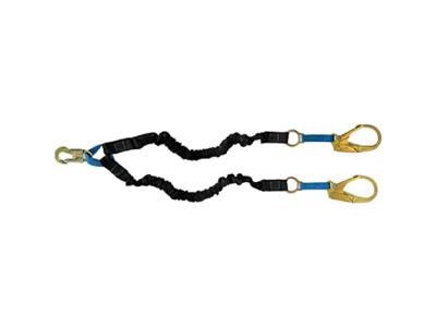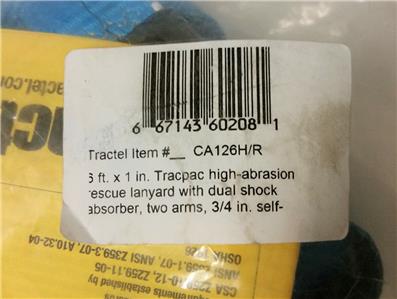 Tracpac High-Abrasion Rescue Lanyard with Dual Shock Absorber 6-Foot x 1-Inch, Two Arms, 3/4-Inch Self-Locking Snap Hook At Shock Pack and 2-1/4-Inch Self-Locking Snap Hook At Each Arm. The Tracpac rescue lanyard with dual shock absorber is composed of a dual shock absorber to which a 13/16-Inch (30 mm) high-abrasion web lanyard is attached. The dual shock absorber prevents injuries from a lateral pull during a fall. The rescue lanyard with dual shock absorber also doubles as a rescue line by providing an in-line connection point which allows the victim to be raised or lowered safely after the fall. The rescue ring on the unit allows the rescue team an easy access connection point so that the lanyard, which is under tension of the victim's weight, can be disconnected from the user's anchorage point allowing for a more effective and time efficient rescue.