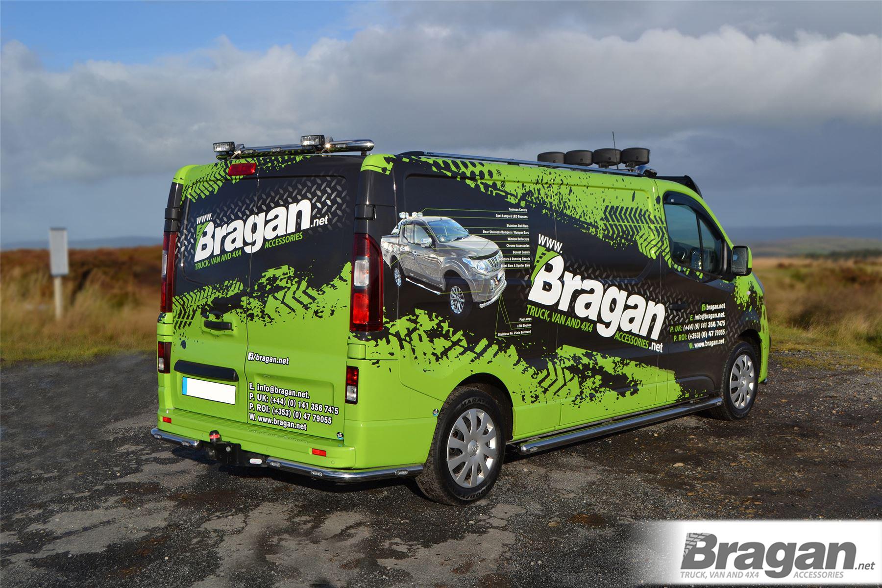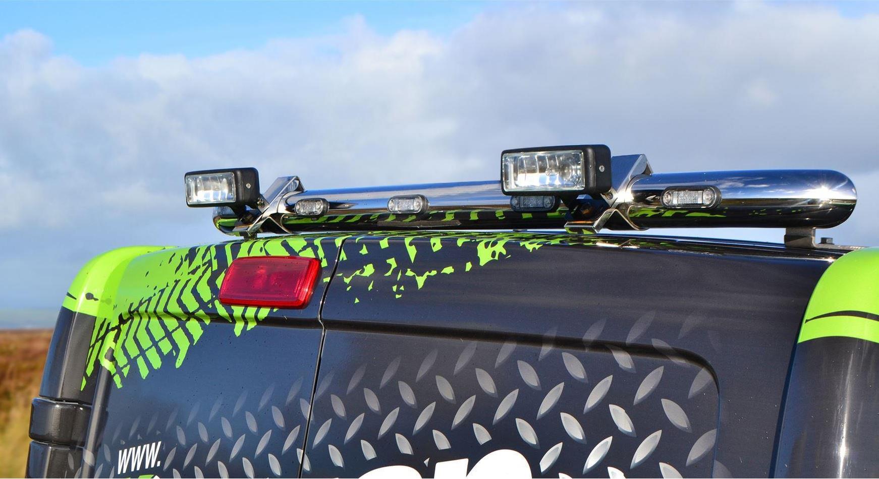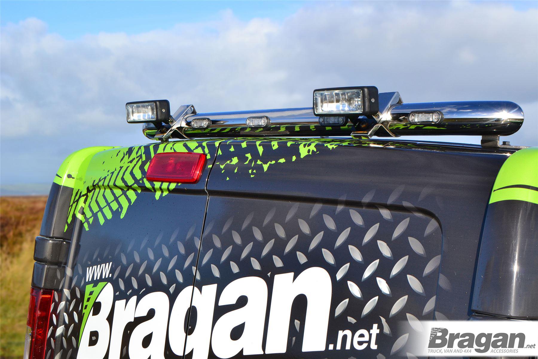 High quality Renault Trafic (2014 - 2022 model) stainless steel rear roof bar with 2x Lamps and 5x LEDs. This top-of-the-range bar will have your vehicle looking top spec at a fraction of the cost of the genuine items but with the same high quality.