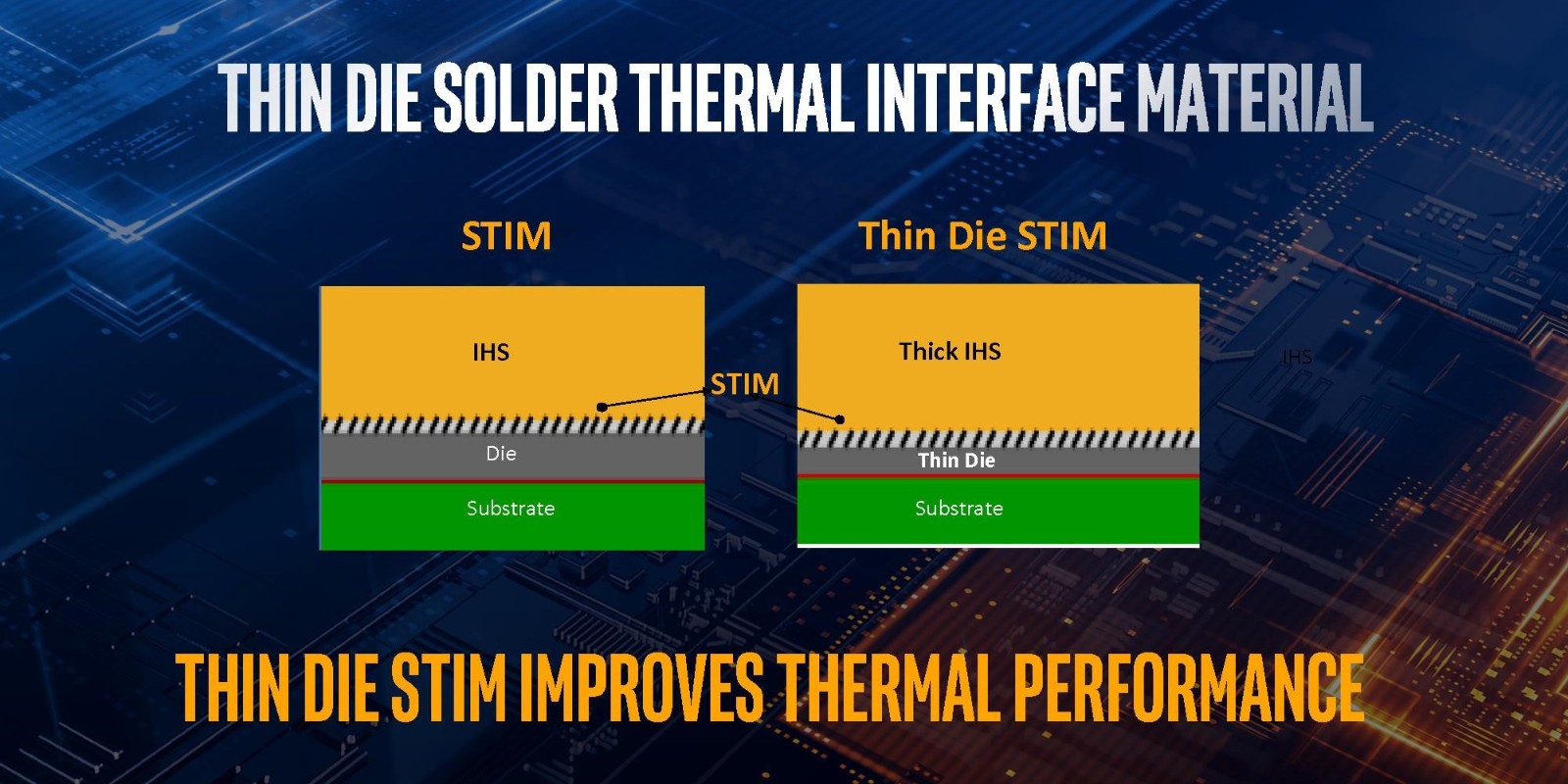 According to Intel, their 10th generation processors incorporate a redesigned substrate with better supporting materials that allow for a thinner die (i.e., the small piece of a silicon wafer on which a microprocessor is fabricated). Then there is the more advanced and thinner STIM (solder thermal interface material) that improves thermal dissipation. Intel also made a thicker IHS (integrated heat spreader), which is the metal "lid" that seats over and protects the delicate processor. The IHS was also made with better heat dissipating materials to compensate for its added thickness. The critical technological improvements were Intel's ability to design and make certain components thinner (i.e., the die and STIM). These advancements improved heat dissipation to the heat spreader, which was then able to more effectively transfer the heat to the external cooler seated over it. The thicker heat spreader was a necessary compromise, because Intel wanted to maintain the same overall processor height (to allow for better compatibility with existing coolers).