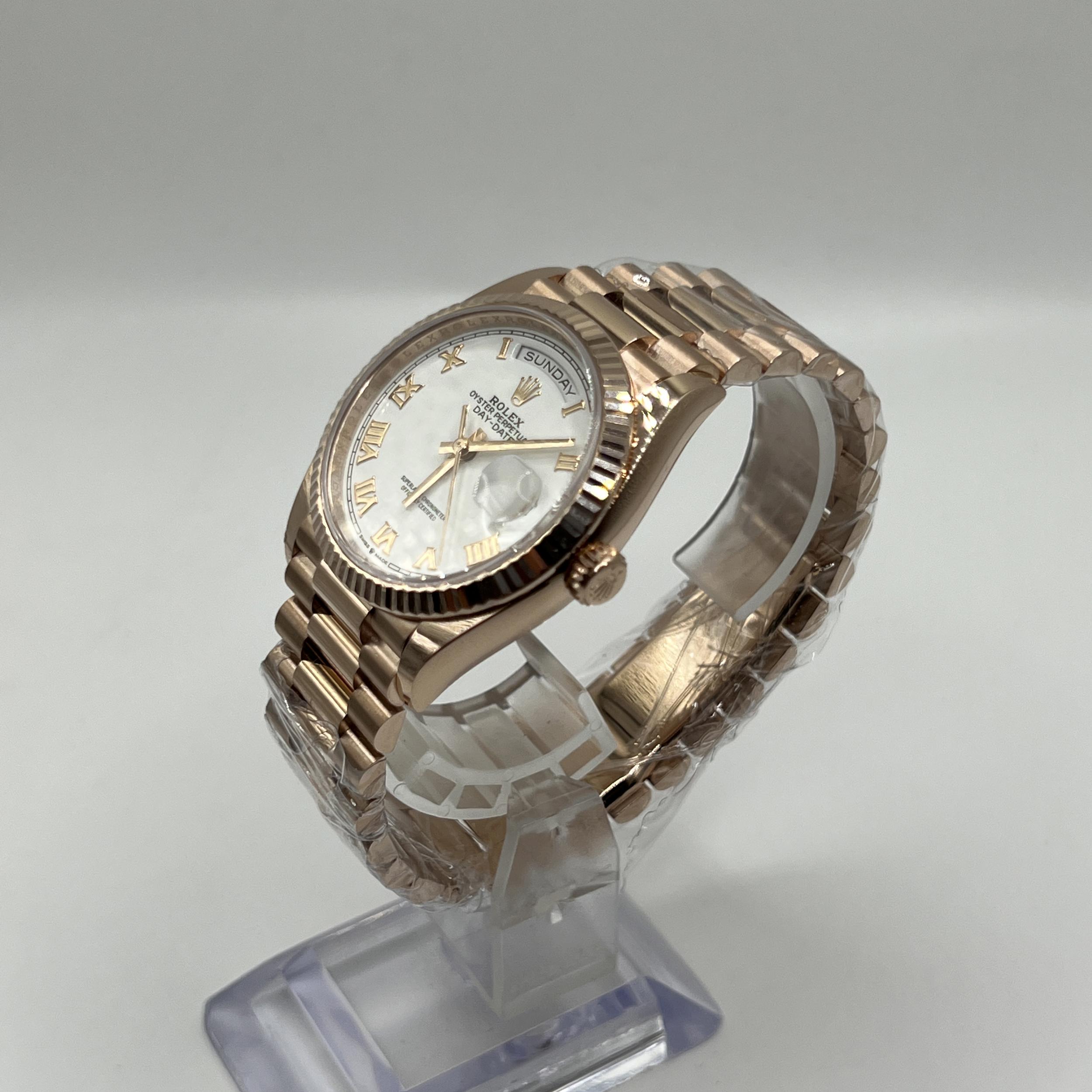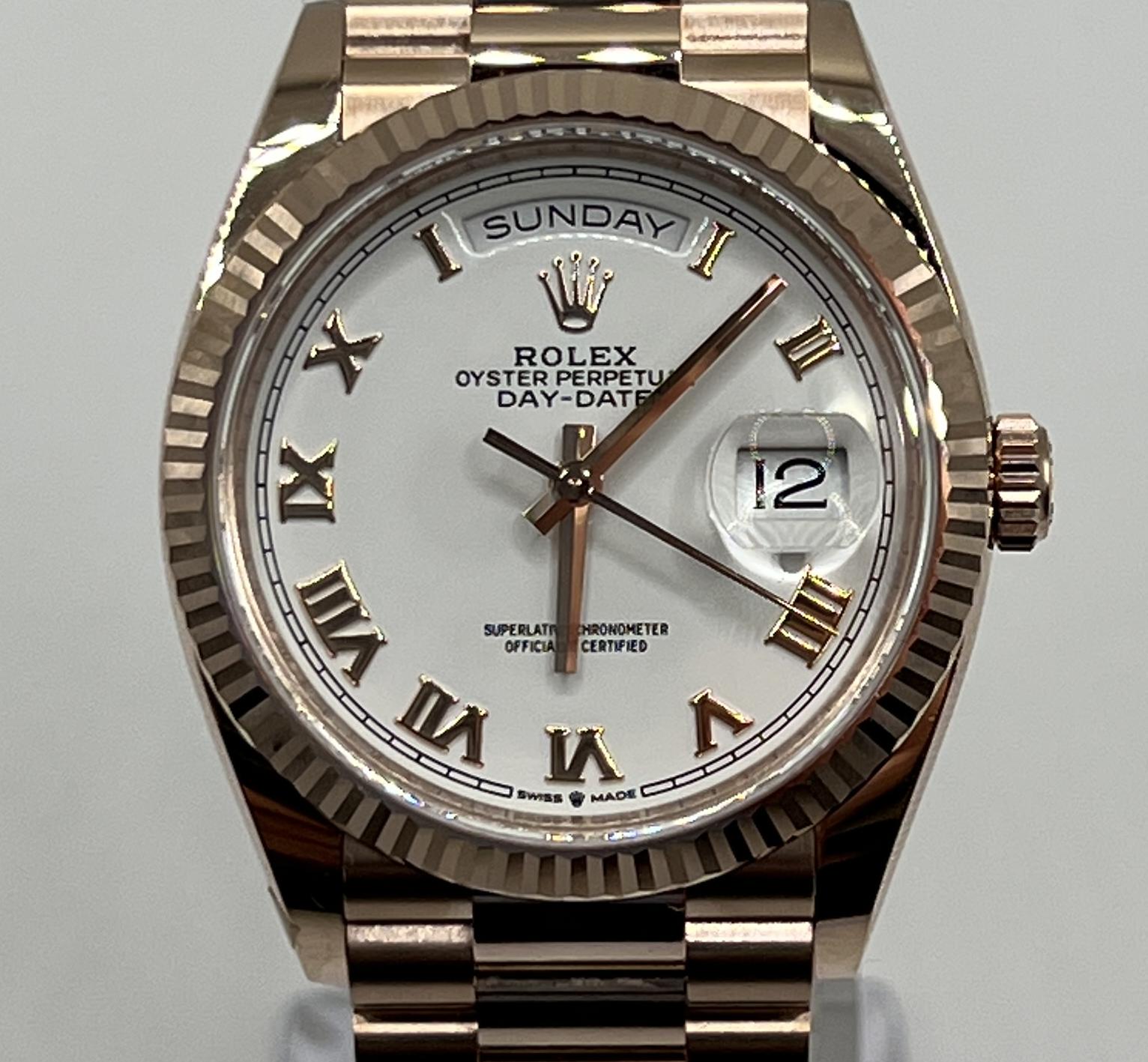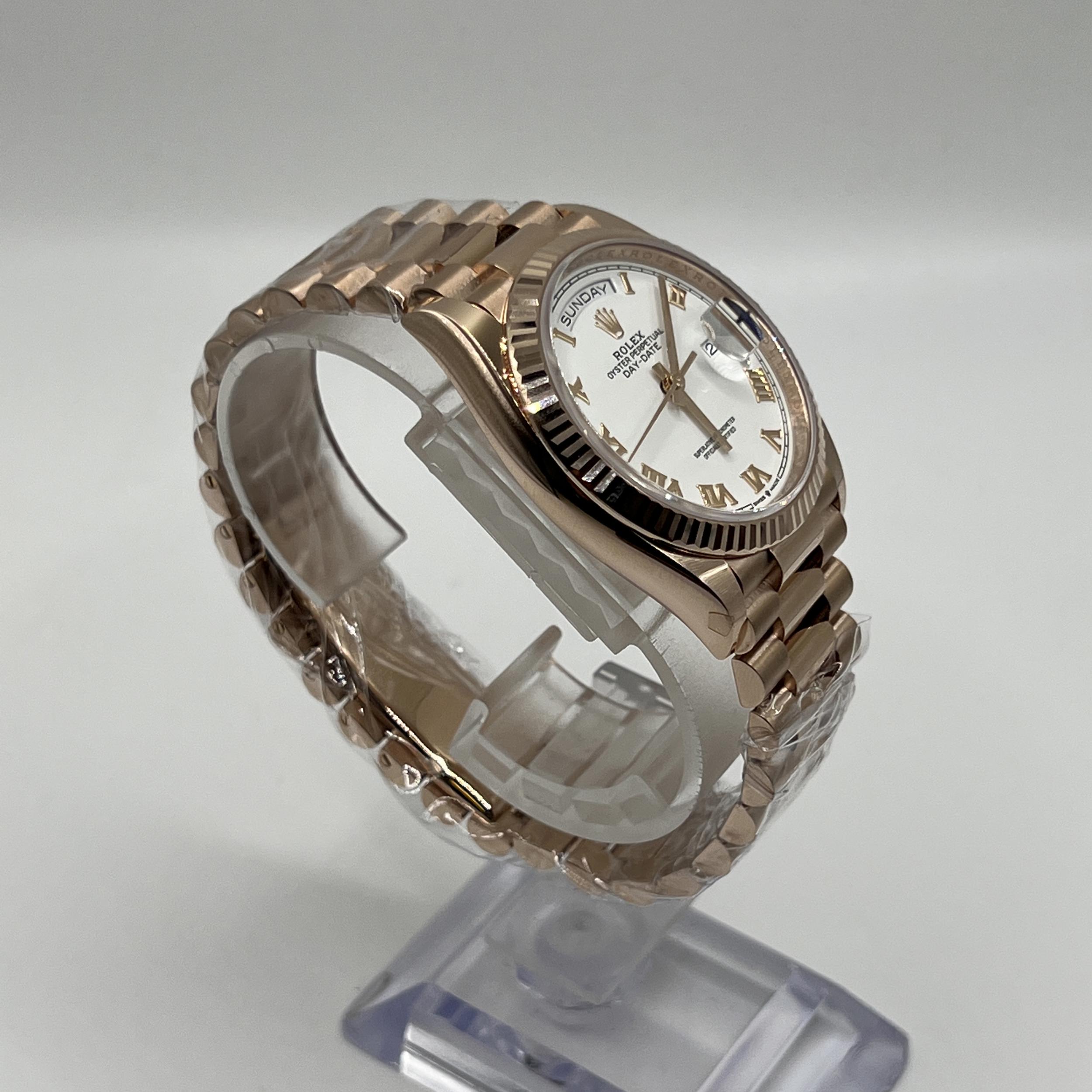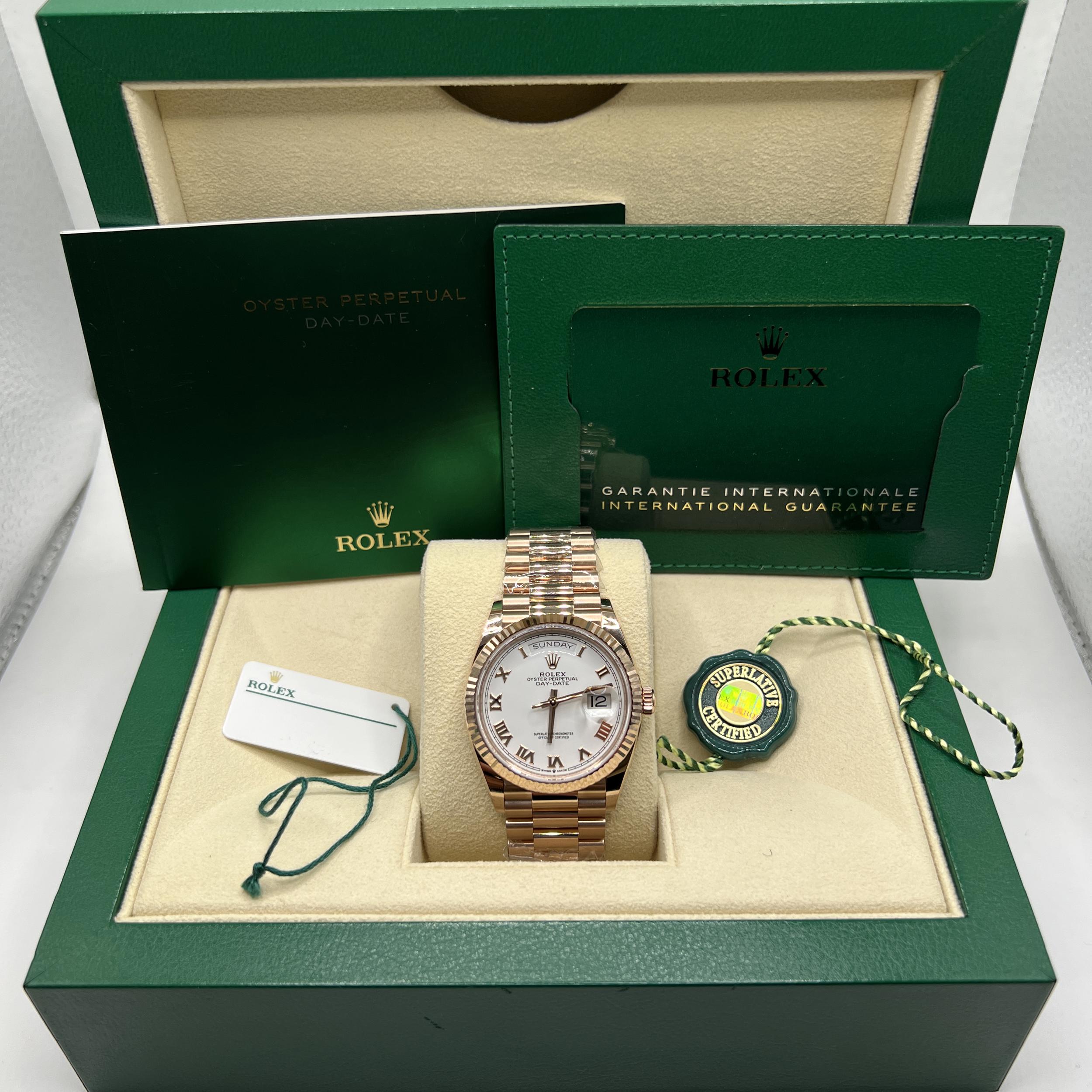 New in Box Rolex Day-Date 36, 18K Everose Gold, on a presidential bracelet with a white roman numeral dial. Watch is new complete with box, papers, guarantee, booklets and hangtag (white tag may be missing).