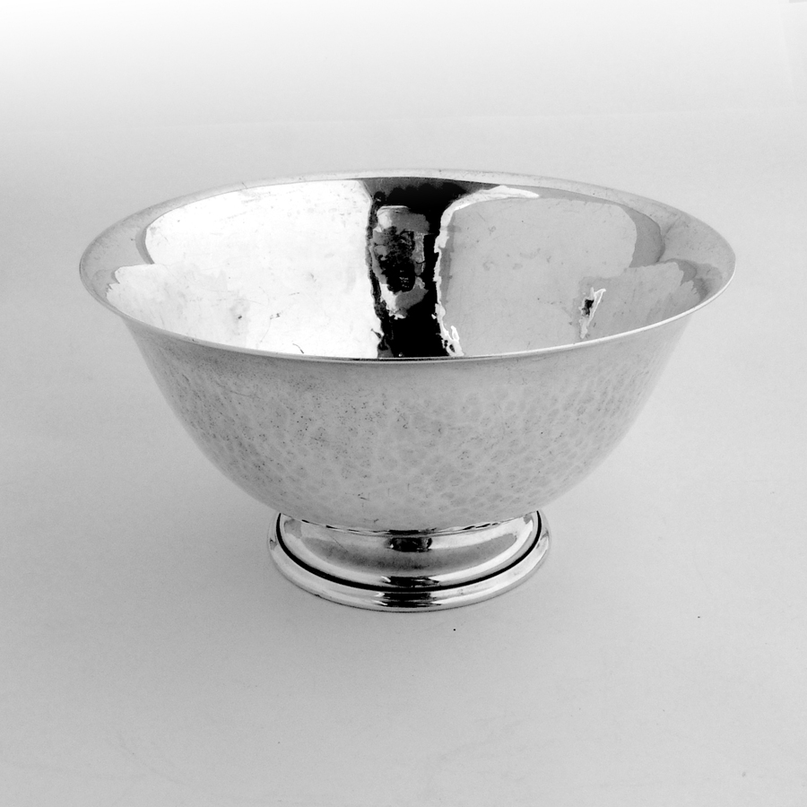 Porter Blanchard hand made sterling silver footed bowl in Arts & Crafts designs, featuring hammered finish. No monograms.