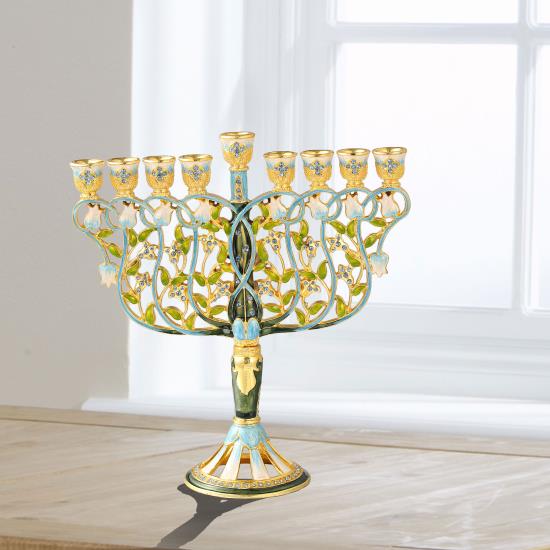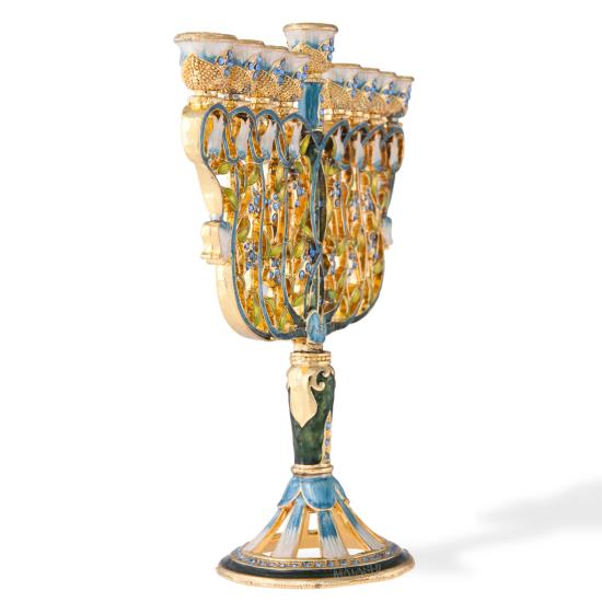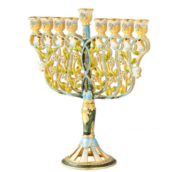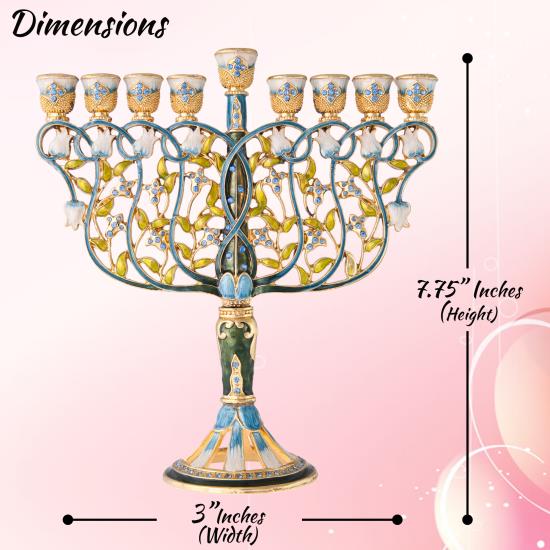 With a bright blue gold and white color motif, the 8 branches are the intertwining branches of beautiful flowers on their stems. The menorah is a nine branched candelabra, traditionally used to celebrate the Jewish holiday of Hanukkah. Every night of the 8-day holiday, another candle is lit with the ‘Shammash' (helper light) the extended branch and extra light. The perfect gift for a spiritual someone in your life as a decoration or religious symbol!