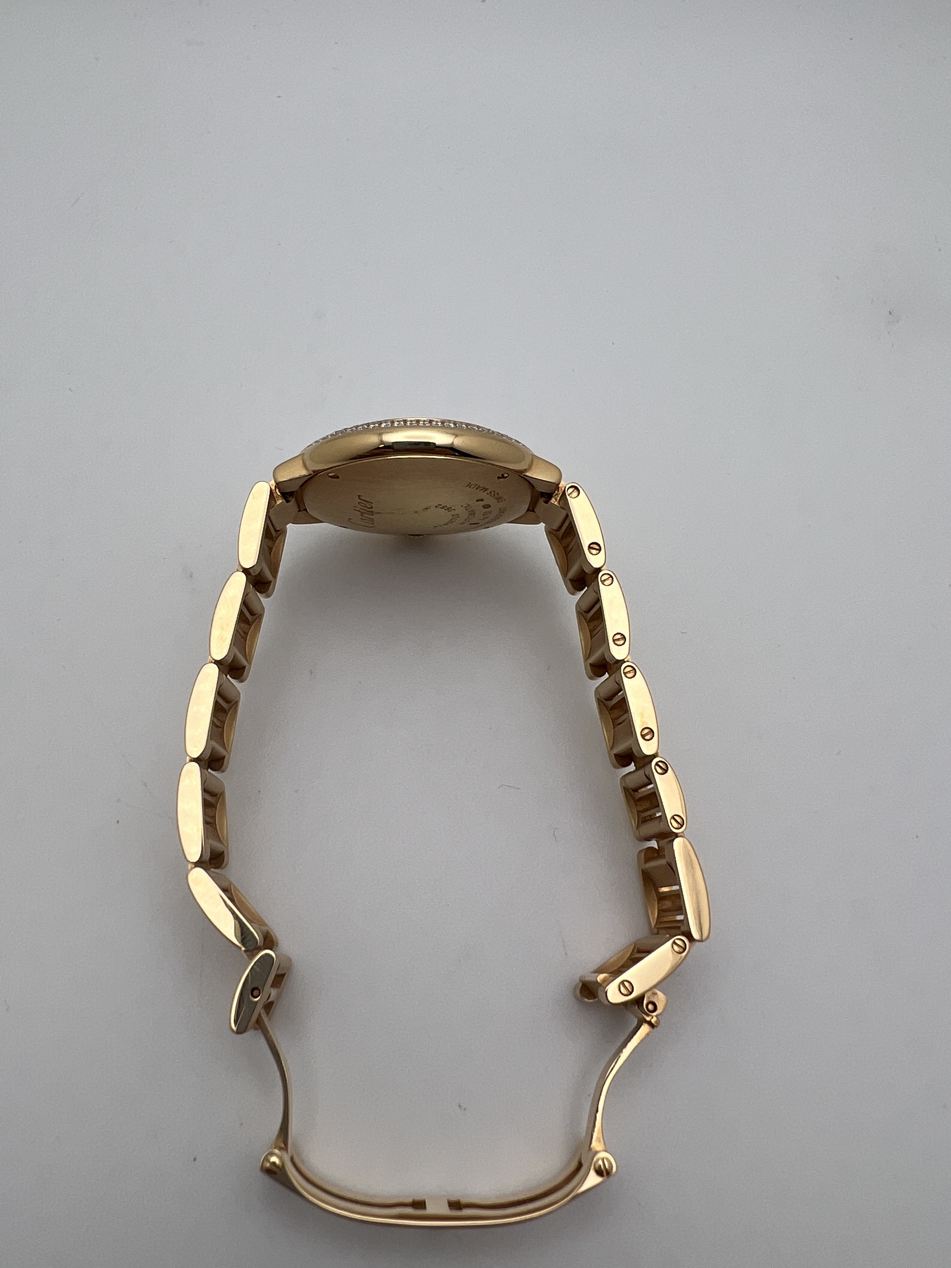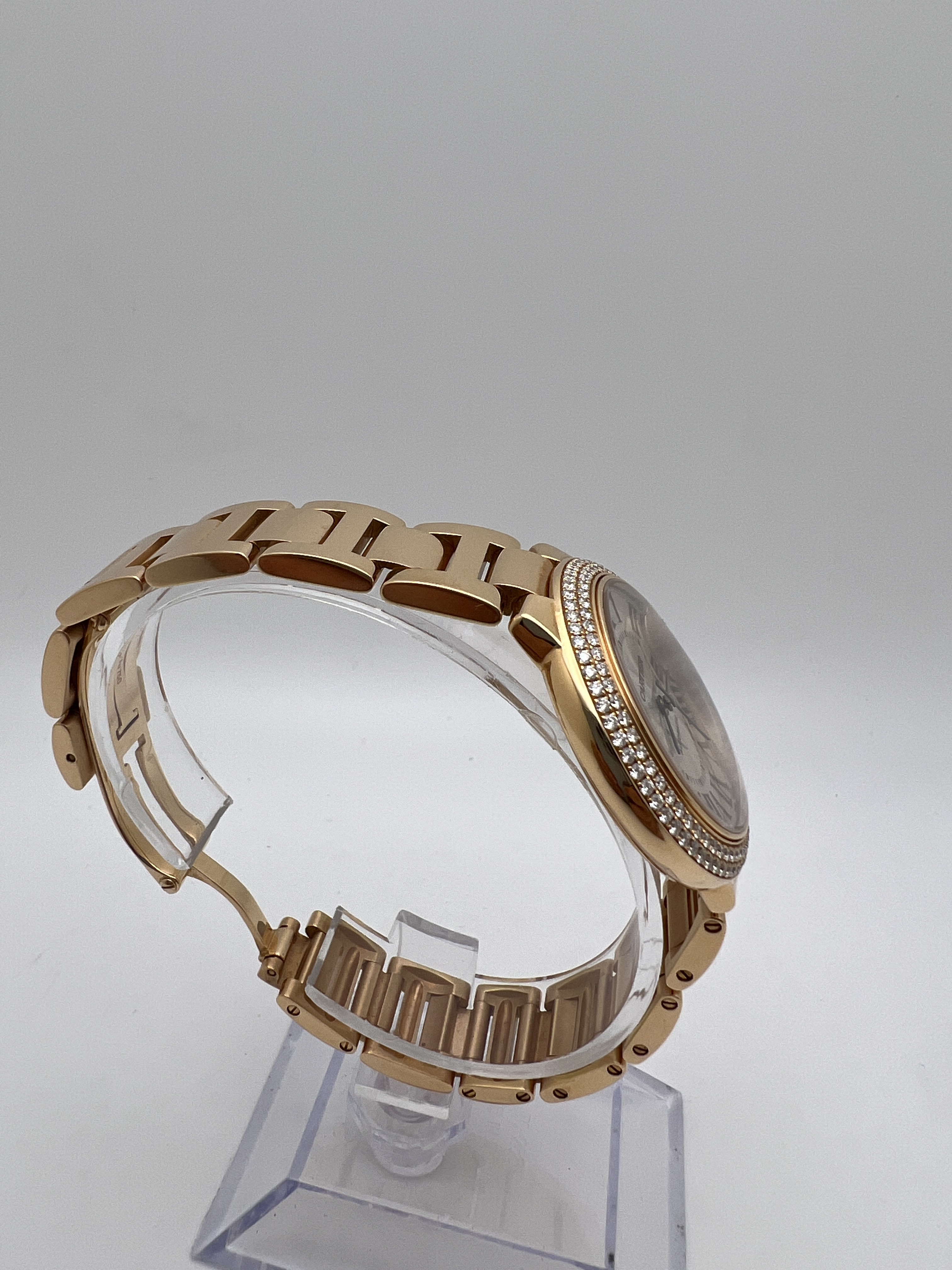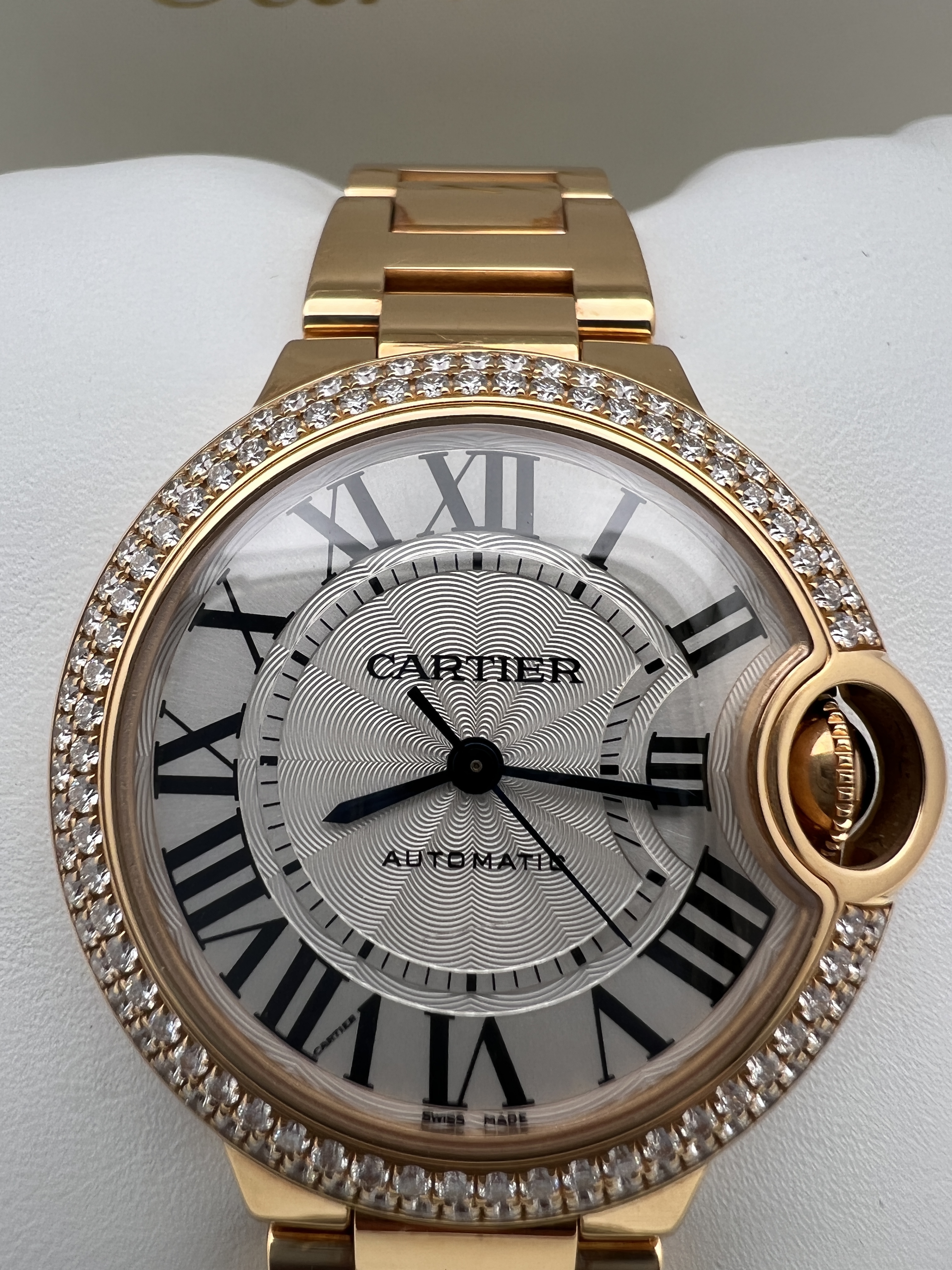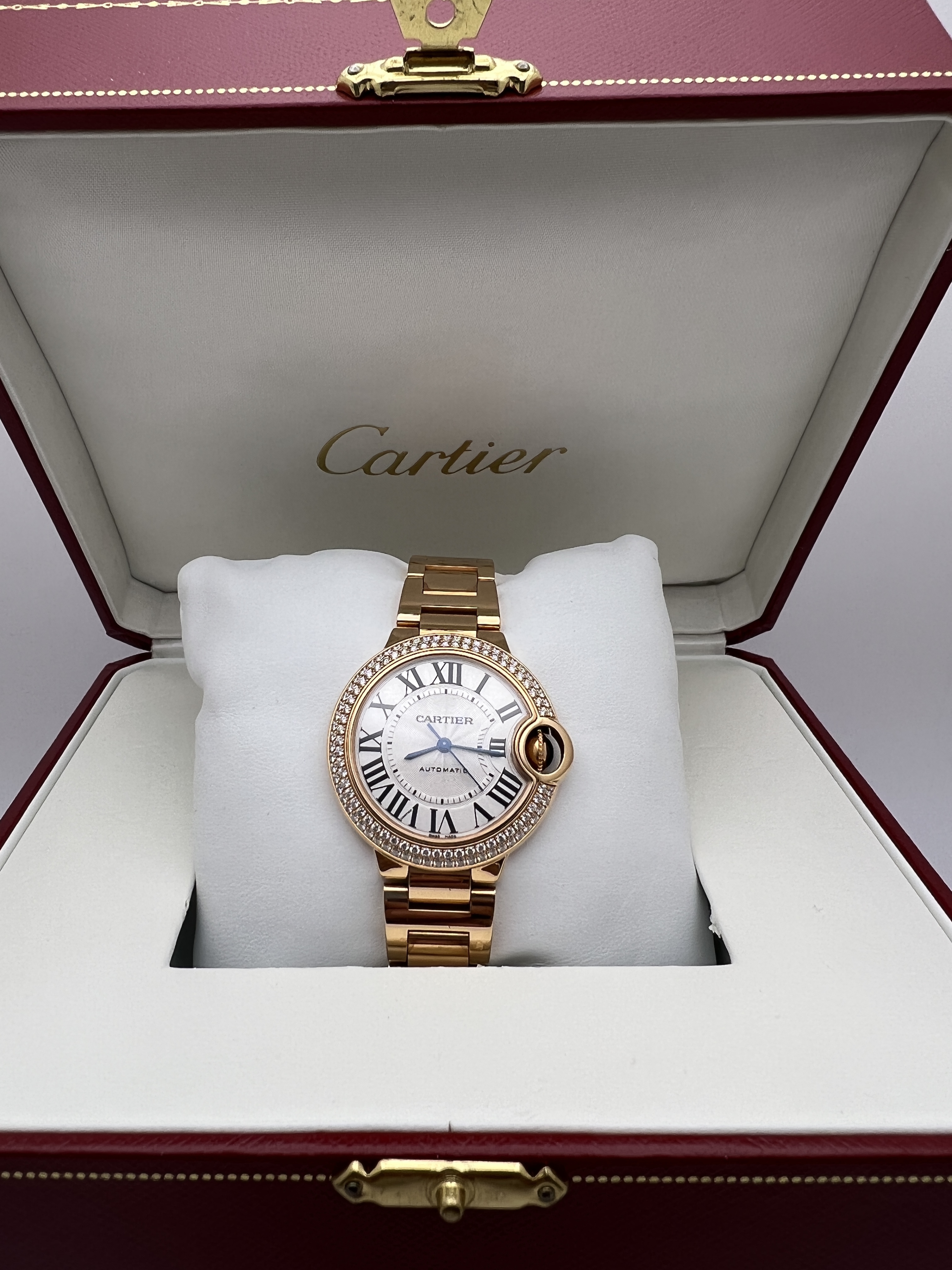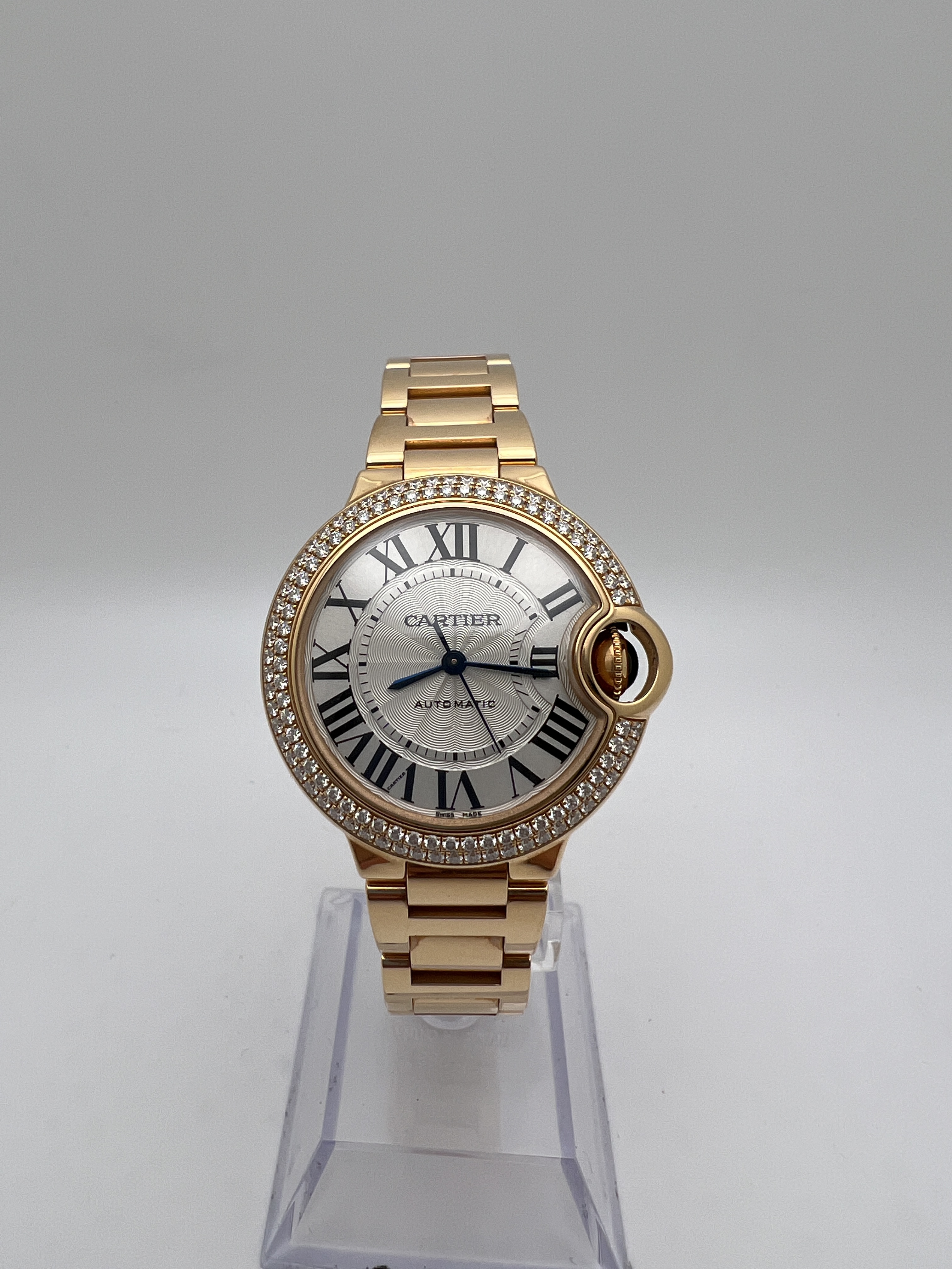 Excellent Condition Cartier Ballon Bleu 33mm 18K Solid Rose Gold with factory diamond bezel. The watch has both certificate of guarantee for the watch as well as the original Cartier Diamond Certificate, certifying that the Bezel is authentic original Cartier Diamonds. The watch comes Complete with Box and Papers, Manuals. 1 Year seller warranty.