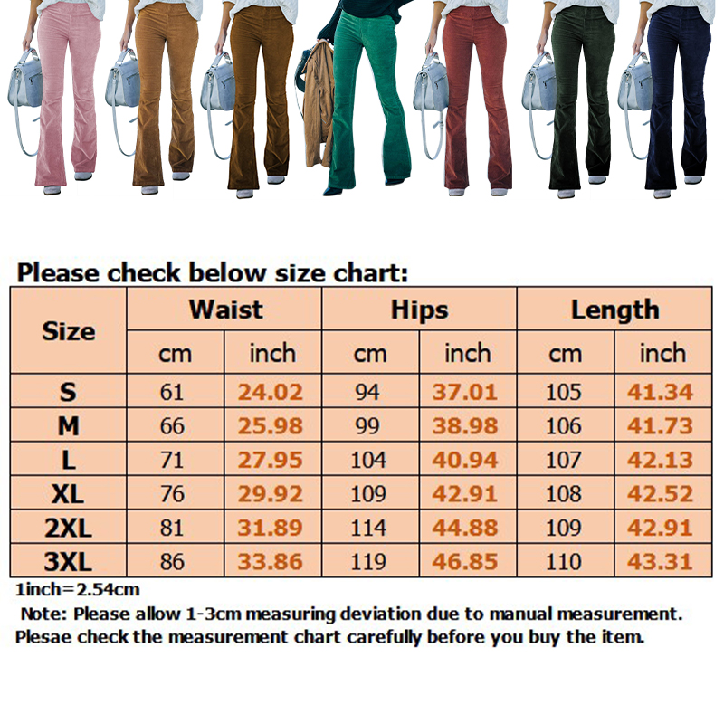 Description: Gender: Women, Woman, Ladies Lady, Female, Girls Style: Women Lounge Pants, Palazzo Trousers, Wide Leg Long Pant, Loose Casual Trousers, Flare Pants, Elastic Waist Flared Pant Pattern Type: Solid Color, Corduroy Color: Green, Brick Red, Camel, Dark Green, Dark Brown, Black, Pink (Optional) Size: S, M, L, XL, 2XL, 3XL (Follow the size chart to select please) Material: 65%Cotton, 35%Polyester Waist: High Waist Length: Full Length Season: Spring, Summer, Autumn, Fall, Winter Occasions: Casual, Traveling, Vacation, Working, Party, Everyday, Dates, Movies, Daily, School, Holiday, Street, Picnic, Beach,Yoga Features: 1. Material: 65%Cotton, 35%Polyester. A good amount of stretch, breathable, skin-touch, makes you feeling well. 2. Design: Women wide leg pants, baggy loose trousers, flare pant, casual palazzo trousers, high waist flared pants, casual and loose. 3. Features: Women lounge pants are designed with solid color, elastic high waist, flared wide leg, lounge pants, high waist palazzo pants for women,yoga pants comfy and chic. 4. Women flared leg pants is soft and skin-friendly, suitable for a variety of occasions.Such as spring, summer, casual, parties, beach, home, holiday, dinner, outdoor, night out, vacation, daily life. 5. The casual loose trousers is very soft and comfortable. Perfect for fashion and classy design, makes it suitable for all daily wear. Package Content: 1 x Women Flare Pants (Other Accessories are not included) Tips: 1. Please compare the detail sizes with yours before you buy!!! 2. Colors may be slightly different depending on computer and monitor settings. 3. Please allow 1-3cm differs due to manual measurement, thanks. (All measurement in cm and please note 1cm=0.39inch, 1inch=2.54cm)