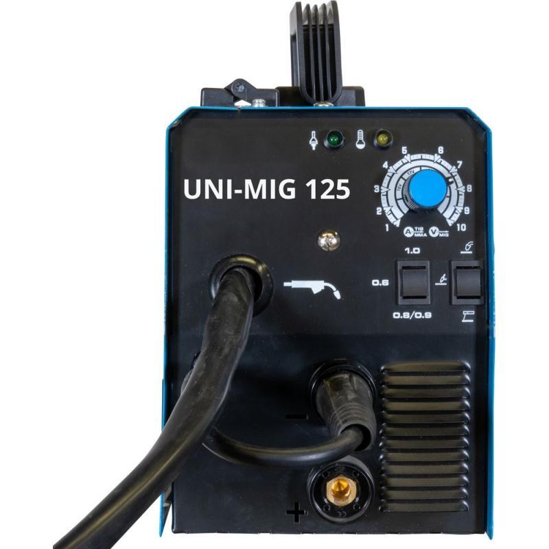 Das Uni-Mig 125 SYN, ist das kleine Multitalent der Inverterschweißmaschinen in der Güde Flotte. Mit dem 120A Gerät sind praktisch alle 4 Schweißverfahren möglich, MIG-MAG, MMA ( Elektrodenschweißen ), Flux ( Fülldrahtschweißen ) und schließlich WIG-Schweißen, mit dem optional erhältlichen WIG-Brenner # 41690. Bestens geeignet für gelegentliche, kurze Einsätze bei kleineren bis mittleren Schweißarbeiten im Heimwerker und Hobbybereich. Die bewährte Zusatzeigenschaft Anti-Stick, sorgt für angenehmen Schweißkomfort, auch bei schwierigen Anforderungen. Elektrodenhalter und Masseklemme, sowie der Bürstenhammer, für MMA-Prozesse sind selbsterverständlich serienmäßig im Lieferumfang enthalten. Gleiches gilt natürlich für den MIG-MAG-Brenner. Der neue, innovative, synergic-geregelte Drahtvorschub stellt sich, nach Auswahl von Schweißverfahren, Drahtstärke und Schweißstärke, automatisch auf die passende Geschwindigkeit ein. Das ebenfalls im Lieferumfang enthaltene Schweißschild sorgt für den notwendigen Schutz beim Schweißen.