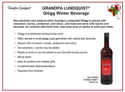 Glögg is a traditional Scandinavian drink during winter, especially around Christmas. Spiced with cinnamon, cloves, cardamom, and citrus. Grandpa Lundquist Glogg is non-alcoholic. It is ready to be gently heated and served at festive celebrations or enjoyed quietly by a fire on a cold winter evening. You may choose to add wine or spirits.