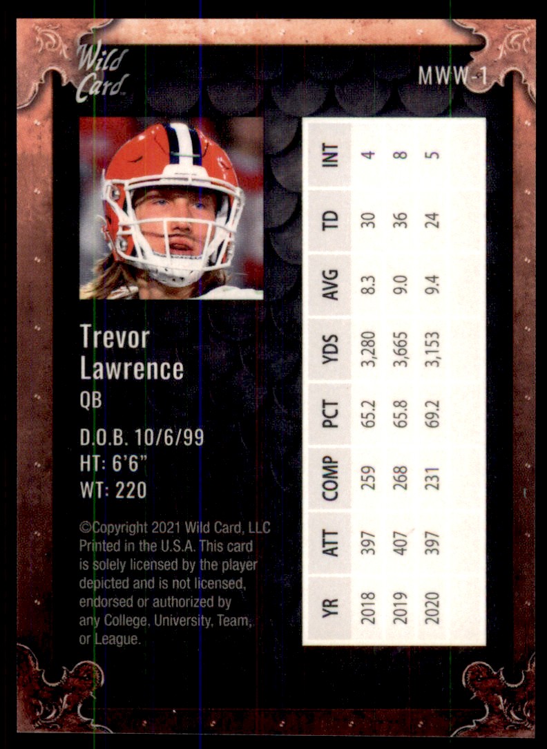 | Description: | Trevor Lawrence | | Category: | Football | | Year: | 2012 | | Product: | Wild Card Matte | | Team: | Clemson Tigers | | Card Number: | MWW-1 | | Dimensions: | 3½" x 2½" |