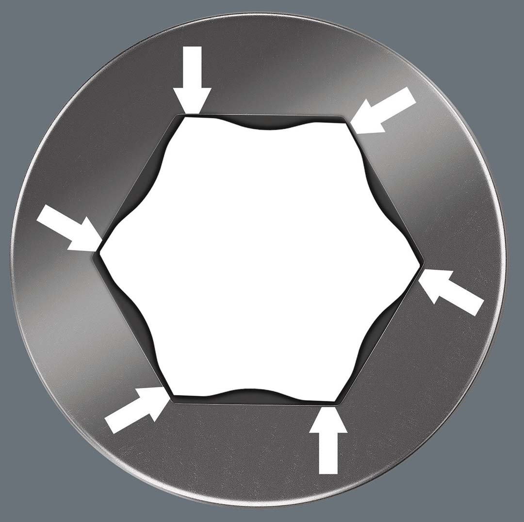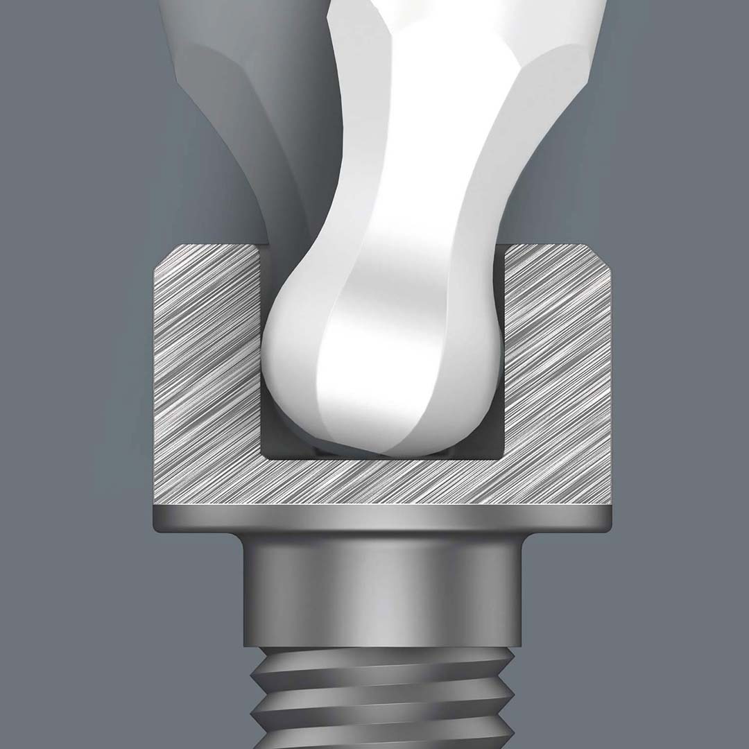 Hexagonal ballpoint end on the long arm: the ballpoint drive profile means that it is possible to swivel the tool axis away from the screwdriving axis, thus enabling "round the corner" screwdriving.