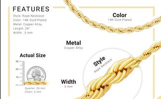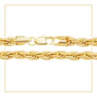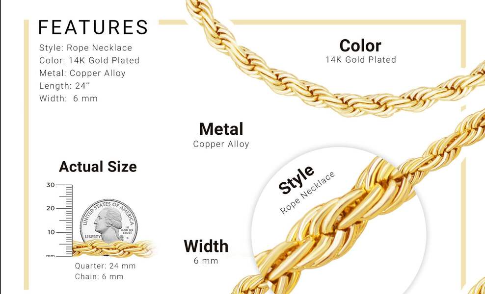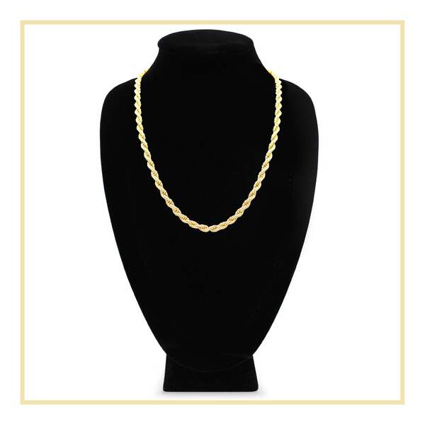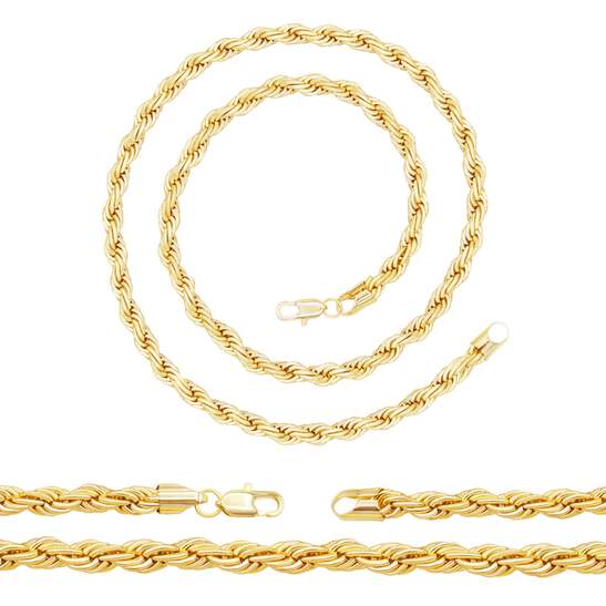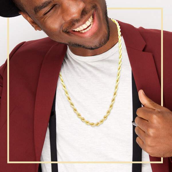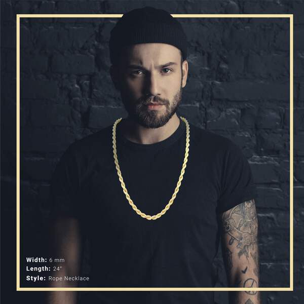 Simple but elegant, this stylish 14K Gold Filled Rope Chain for men will turn heads wherever you go. Constructed with solid 14K Gold Filled copper with high polished shiny surface, our Rope chains resist tarnish, hypoallergenic, nickel free, and safe for sensitive skins. Our Rope Necklace for men is 24" long and comes in 2 sizes: 5 mm, 6 mm. The elegant Lobster Claw Clasp makes for a secure fit so that your jewelry stays in place, and can be put on and taken off easily. Sun ImperialĀ is the perfect luxury gift for any occasion such as birthdays, fathers-days and anniversaries. The 14K Gold Filled Chain jewelry for men comes in a premium packaging to provide the gift with the extra look.