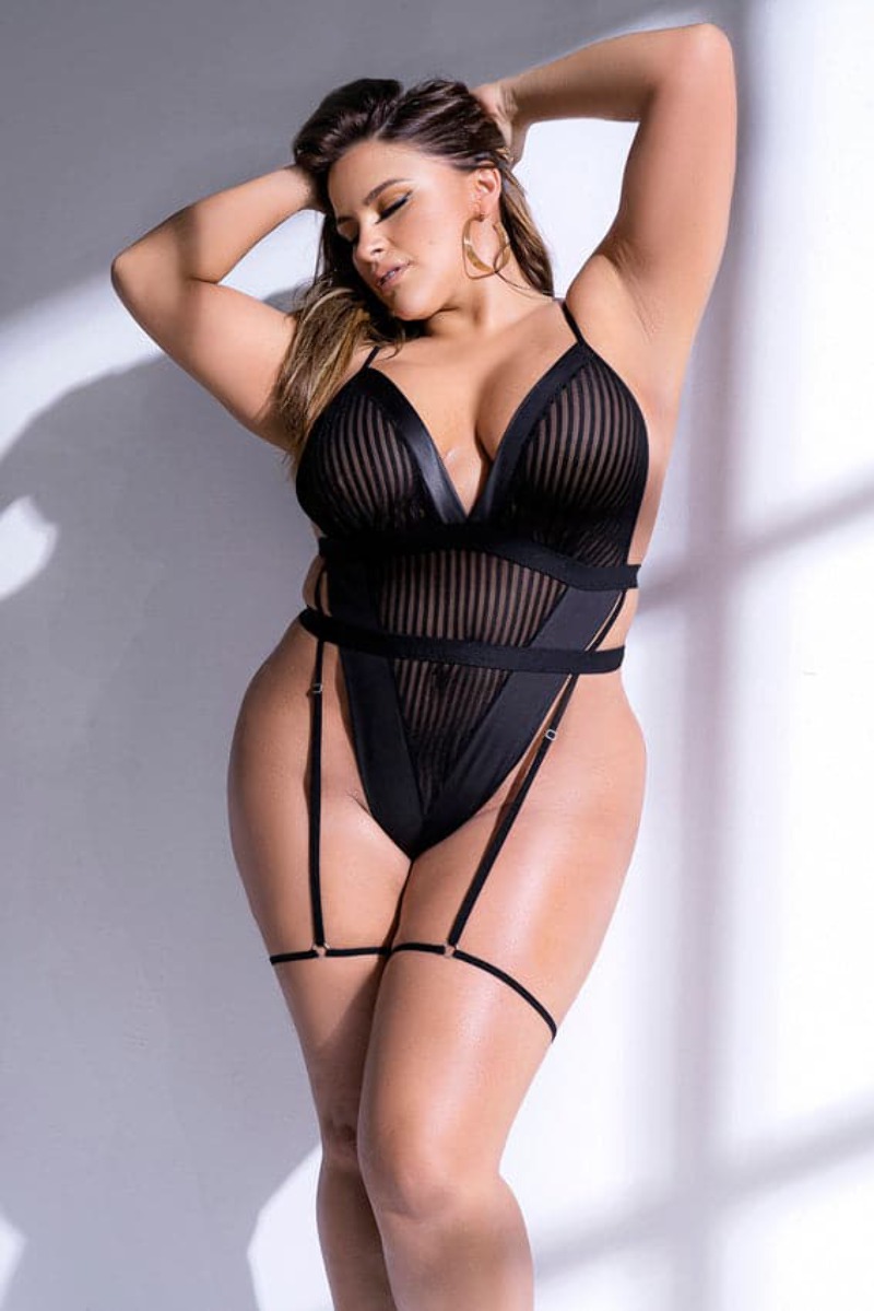 Empowering design for every body. The plus size striped mesh bodysuit delivers the same structured, striking design in a generous, flattering fit.