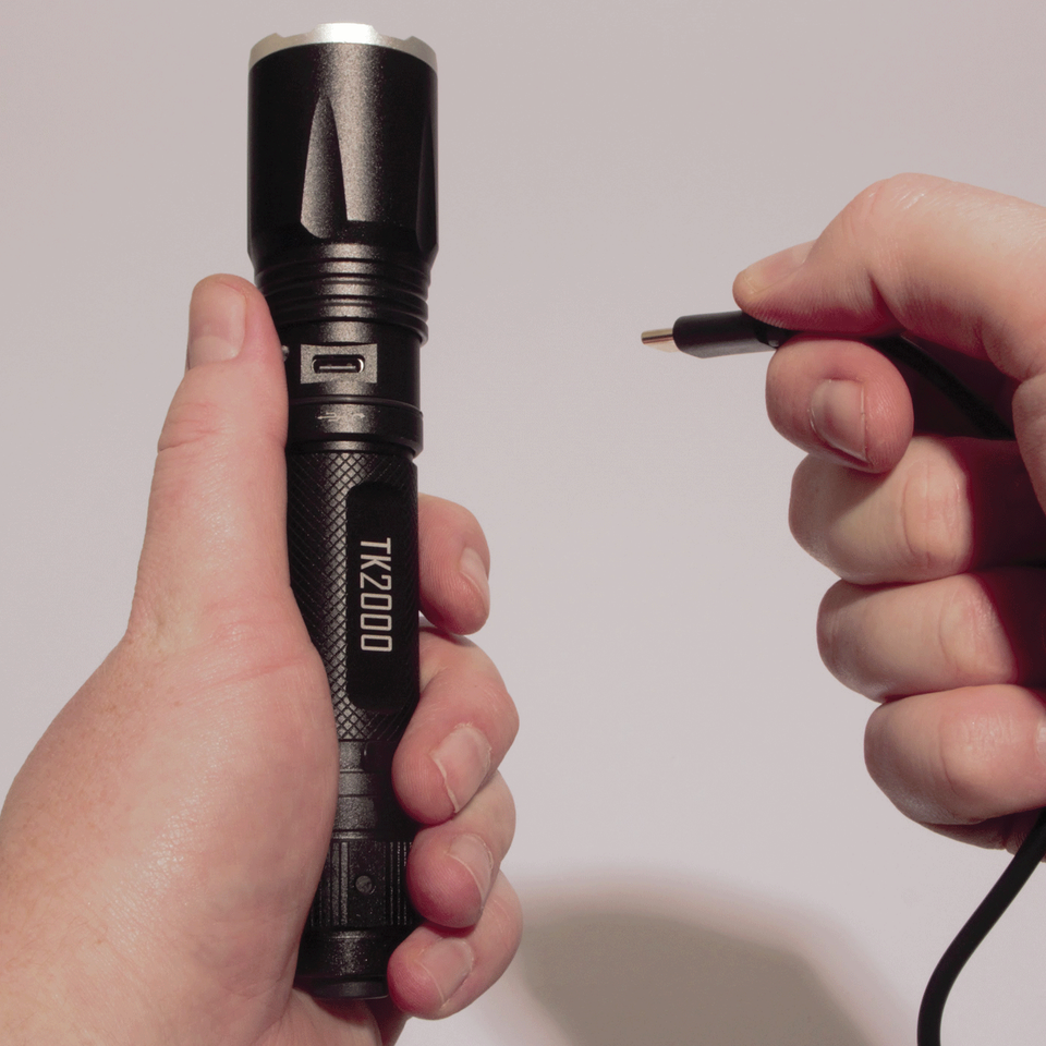 The ultimate LED tactical USB rechargeable flashlight kit. This flashlight offers 2000 lumens of bright light with a Made in USA CREE XHP50 LED chip. This super bright LED flashlight offers 3 different preset light modes (High, Low, Strobe). An adjustable zoom function comes in handy and delivers a wide-to-narrow light beam to focus in on objects up to 1000 feet away. The USB rechargeable flashlight offers a dual tail switch for instant activation and when the flashlight is powered off, simply hold down the small button to activate the strobe light. To recharge the flashlight, twist the head of the flashlight to access the charging port and insert the USB Type-C cable.