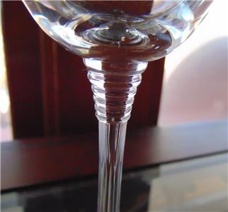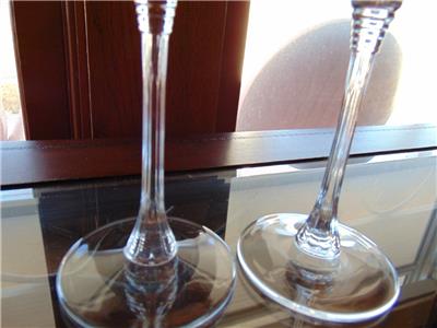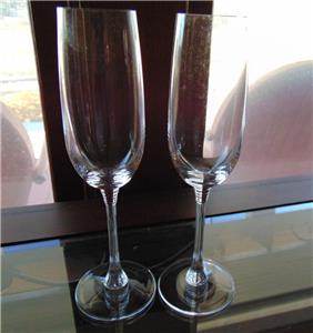 This listing is for a pair of crystal champagne flutes. The bowl portions are plain, and the stem has vertical cuts with rings at the top of the stem. Height is 8 7/8 inches and the rim diameter is about 1 3/4 inches. Capacity is 6 ounces when filled to the brim.