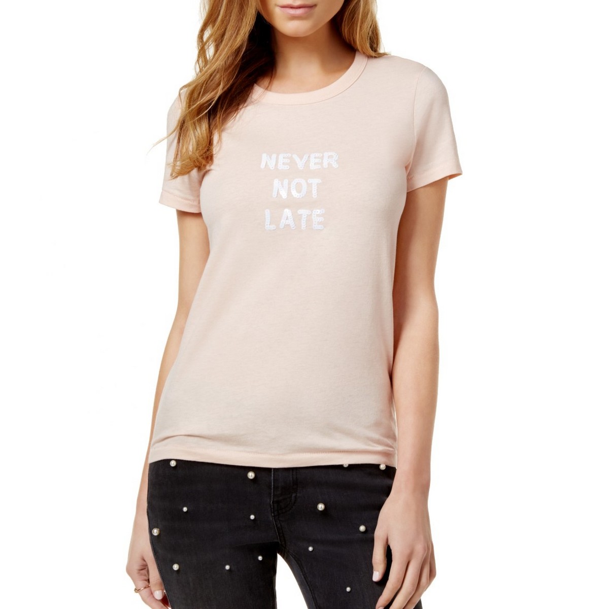 BOW & DRAPE NEW Women's Never Not Late Sequined Graphic Casual T-Shirt Top TEDO