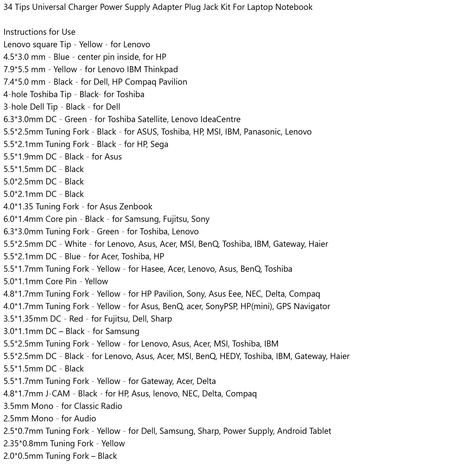 34 Tips Universal Charger Power Supply Adapter Plug Jack Kit For Laptop Notebook