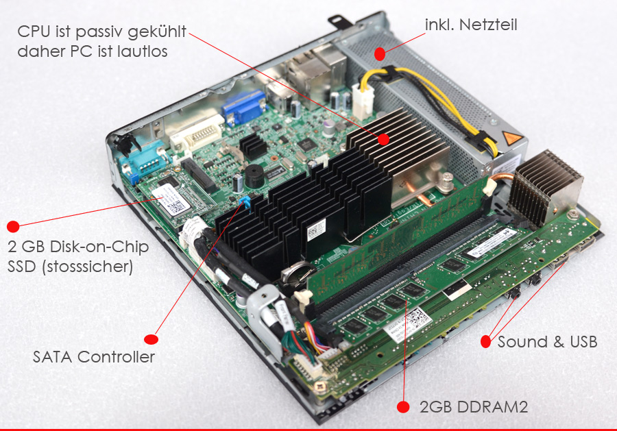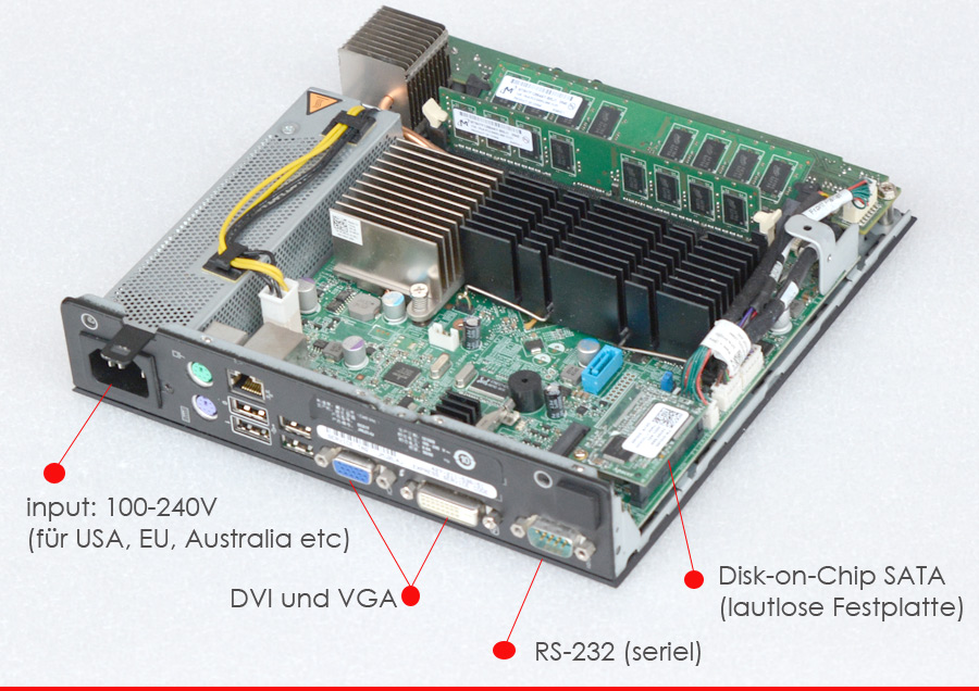 Windows 2000 with Allen drivers, Stoss-proof 2GB hard drive on SSD base (disk-on-chip) + 80 GB hard drive for your data, 2x PS/2, VGA + DVI, power supply, gigabit network, USB and sound card