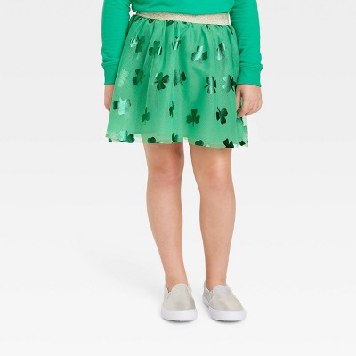 They'll love to dress up for any St Patty's Day celebration with this St. Patrick's Day Tutu Skirt from Cat and Jack?. This green tutu skirt features an allover foil print shamrock pattern for fun, festive-themed style. The lightweight mesh material with soft taffeta lining offers comfortable all-day wear, while the glittery elastic waistband provides an easy pull-on fit and a touch of shine. They can pair this tutu skirt with a variety of tops to complete their look. Cat and Jack?: Classics with an imagination of their own. Gender: female. Age Group: kids. Pattern: Leaf. Material: Recycled Polyester.