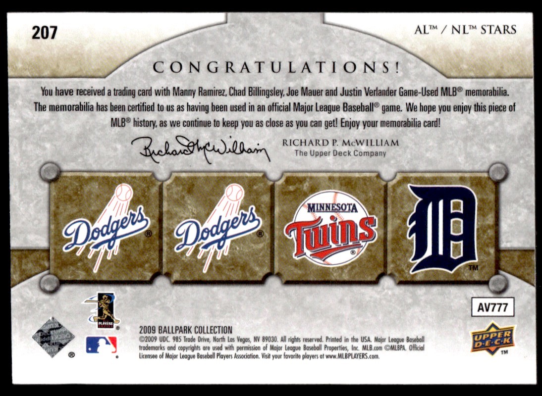 | 2009 Upper Deck Ballpark Collection JERSEY /400 207 MANNY RAMIREZ/BILLINGSLEY/MAUER/VERLANDER | ||||||||||||||||