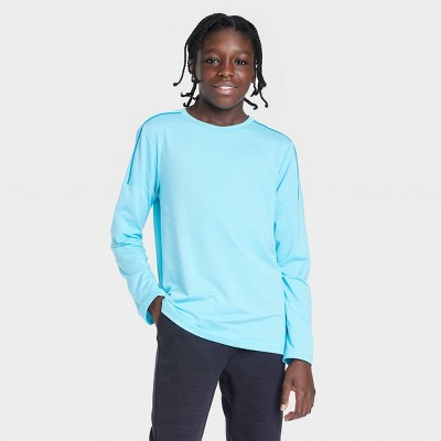 Why we're ALL IN: Gym T-shirt made with soft and stretchy fabric offers flexible comfort during all your child's activities. The drop shoulder design with contrasting piping lends an eye-catching look. Designed with pullover style for easy wear and removal and a below-waist length for easy layering over their favorite track pants or any other bottoms. All in Motion?: Made for every move, priced for every day. Size: XS. Color: Light Blue. Gender: male. Age Group: kids. Pattern: Solid. Material: Recycled Polyester.