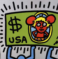 Additional Details: In 1990, TeNeues Publishing in Kempen, Germany, released an offset lithograph reproduction of Keith Haring's "Andy Mouse Dollar Bill," with the approval of the Keith Haring Foundation. This artwork, originally created in 1986, is a fusion of Disney's Mickey Mouse and artist Andy Warhol, symbolizing the intersection of pop culture and art. The 1990 TeNeues reproduction made Haring's work more accessible, allowing a wider audience to appreciate his unique style and thematic explorations. It remains a significant example of Haring's impact on contemporary art and his ability to merge art with popular culture.
