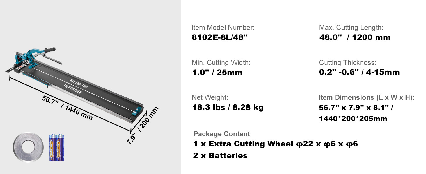 Rendimiento eficiente: Esta herramienta para cortar azulejos está diseñada para realizar proyectos de renovación en el hogar de manera rápida y sencilla. Longitud máxima de corte: 1200 mm. Grosor de corte: 4-15 mm. Compatible con: azulejos de pared y azulejos pulidos. No apta para: mármol, granito, azulejos con superficies irregulares y piedra microcristalina con una capa de cristal de 0,5-3 mm.