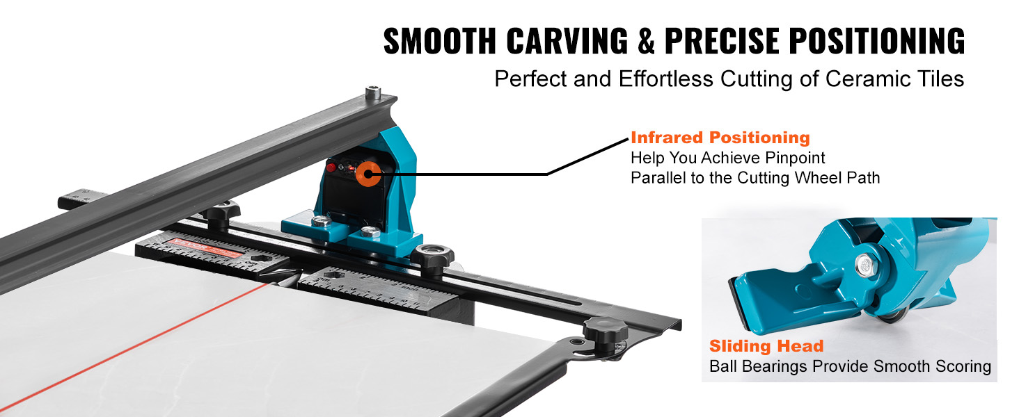 Marcado preciso: La función de infrarrojos facilita un posicionamiento exacto y la creación de líneas rectas. La guía metálica alineada con la trayectoria de la rueda de marcado y el cabezal deslizante con rodamientos de bolas aseguran un movimiento fluido, permitiendo cortes de baldosas con alta precisión.