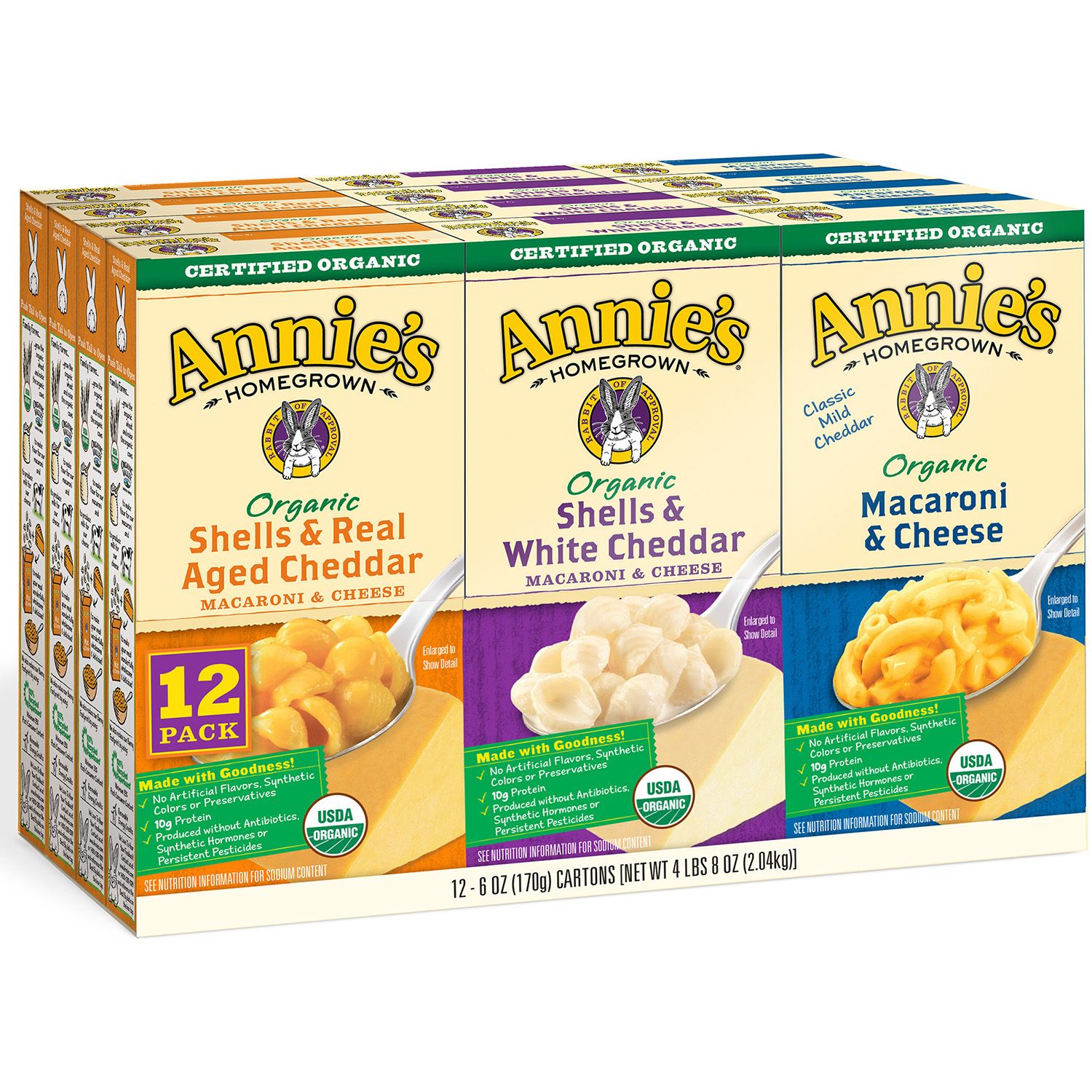 - Cheese from cows not treated with the growth hormone, rBST - 10g of protein in each serving - Includes: Organic Shells & White Cheddar (4 - 6 oz. boxes), Organic Classic Mac & Cheese (4 - 6 oz. boxes), Organic Shells & Real Aged Cheddar (4 - 6 oz. boxes) - Three flavors: White Cheddar, Classic, Real Aged Cheddar - No artificial flavors, synthetic colors or preservatives