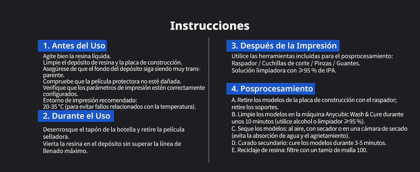 【Curado rápido y gran estabilidad】 La resina de fotopolímero ANYCUBIC se desarrolló especialmente para reducir el tiempo de formación con su extraordinaria fluidez, y el modelo 3D muestra una buena estabilidad en ambientes húmedos y corrosivos después del curado.