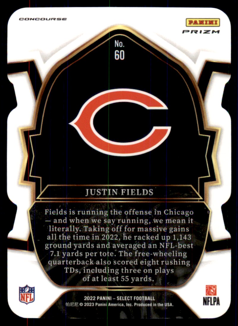 | Description: | Justin Fields | | Category: | Football | | Year: | 2022 | | Product: | Panini Select | | Set: | Red/Black Die-Cut Prizm | | Team: | Chicago Bears | | Dimensions: | 3½" x 2½" |