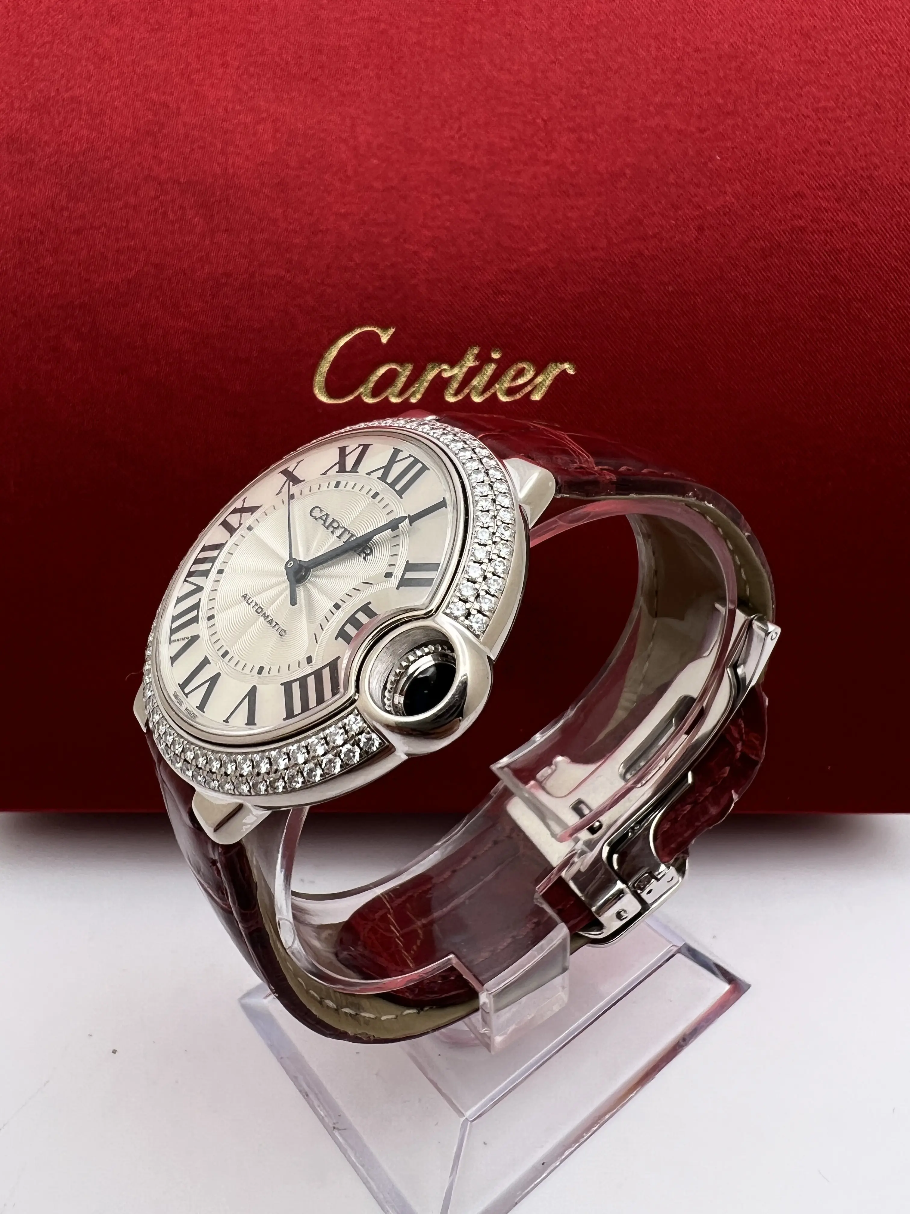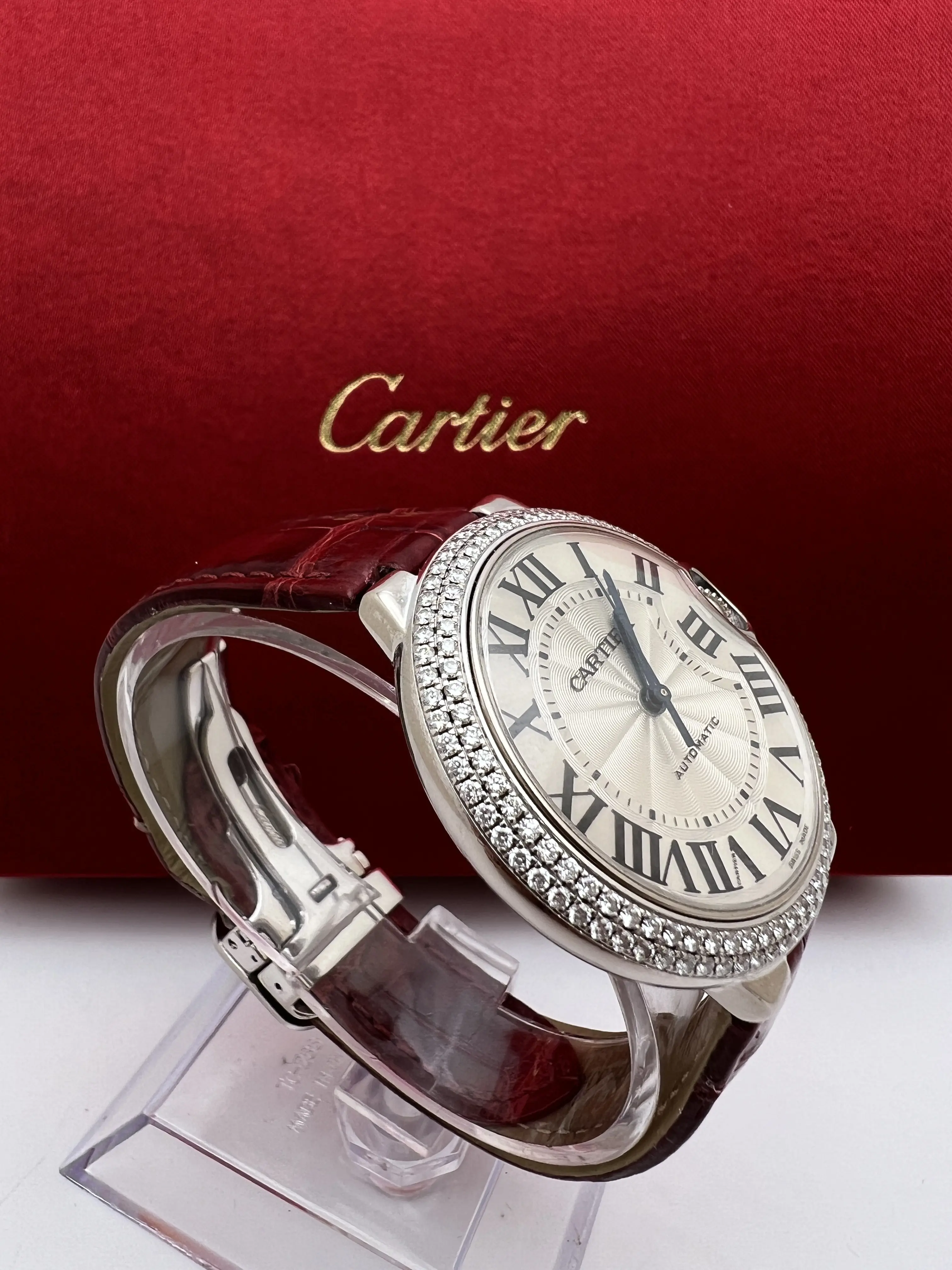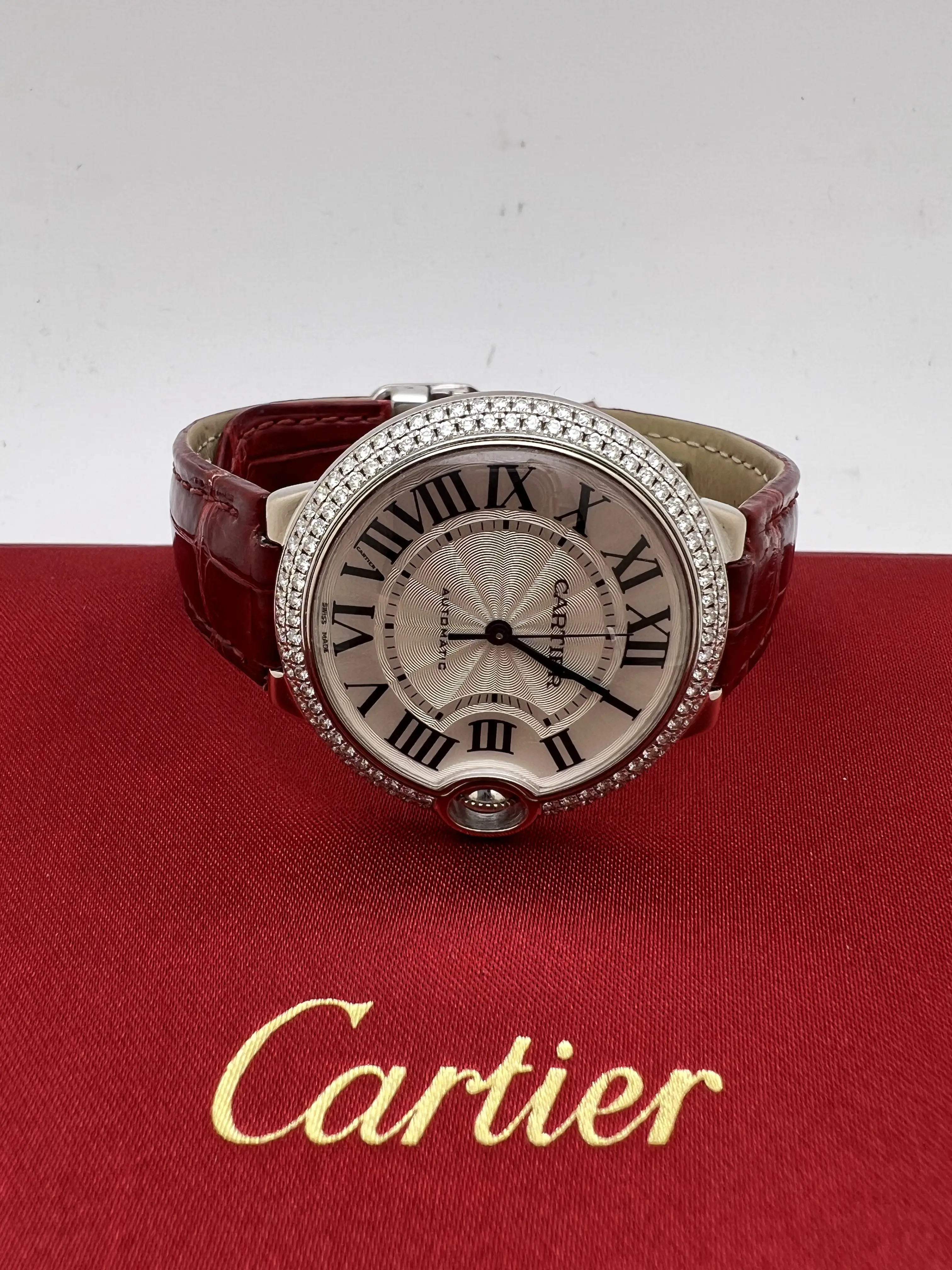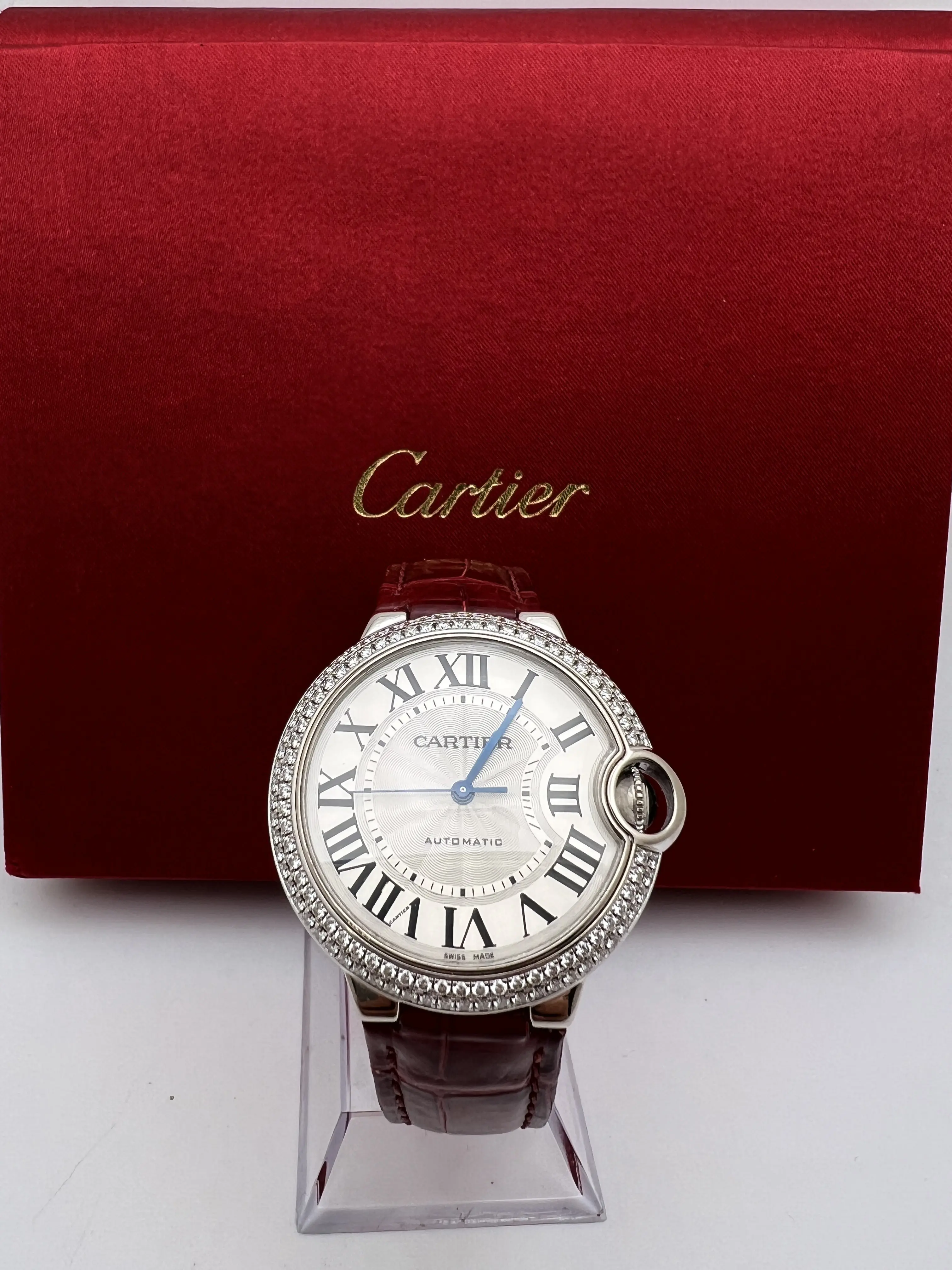 Cartier Ballon Bleu 36mm 18k White Gold Case with Factory Diamond Bezel, featuring the signature guilloche dial with Roman Numeral Markers and date window, blue sword hands and sapphire cabochon set upon the crown, automatic movement, 18K White gold deployant buckle and burgundy alligator leather band. Watch comes complete with Box and Double Guarantee Papers - for both the watch and the diamonds from Cartier. Opportunity to get an incredible watch at a huge discount, factory original just like from the boutique!