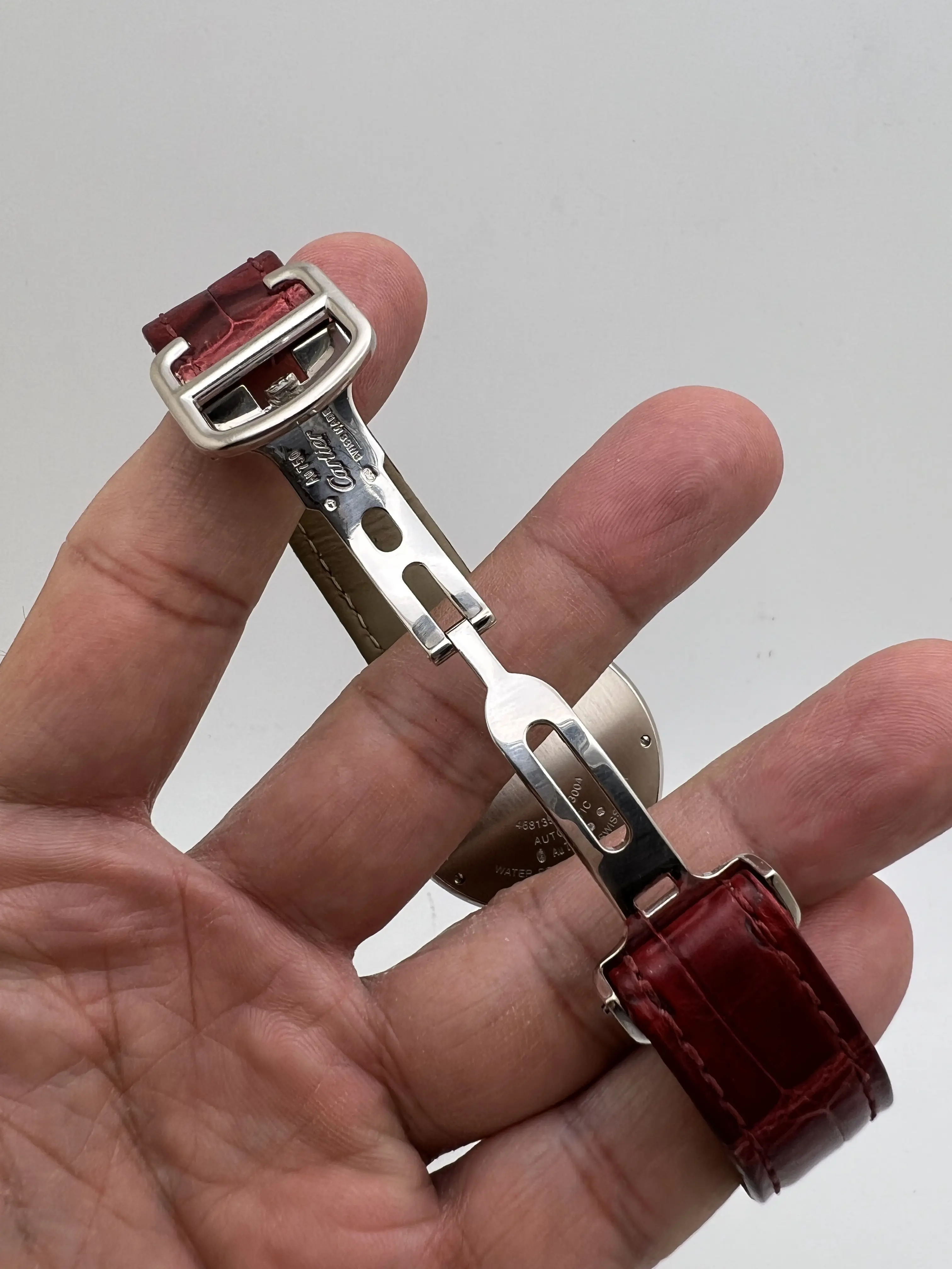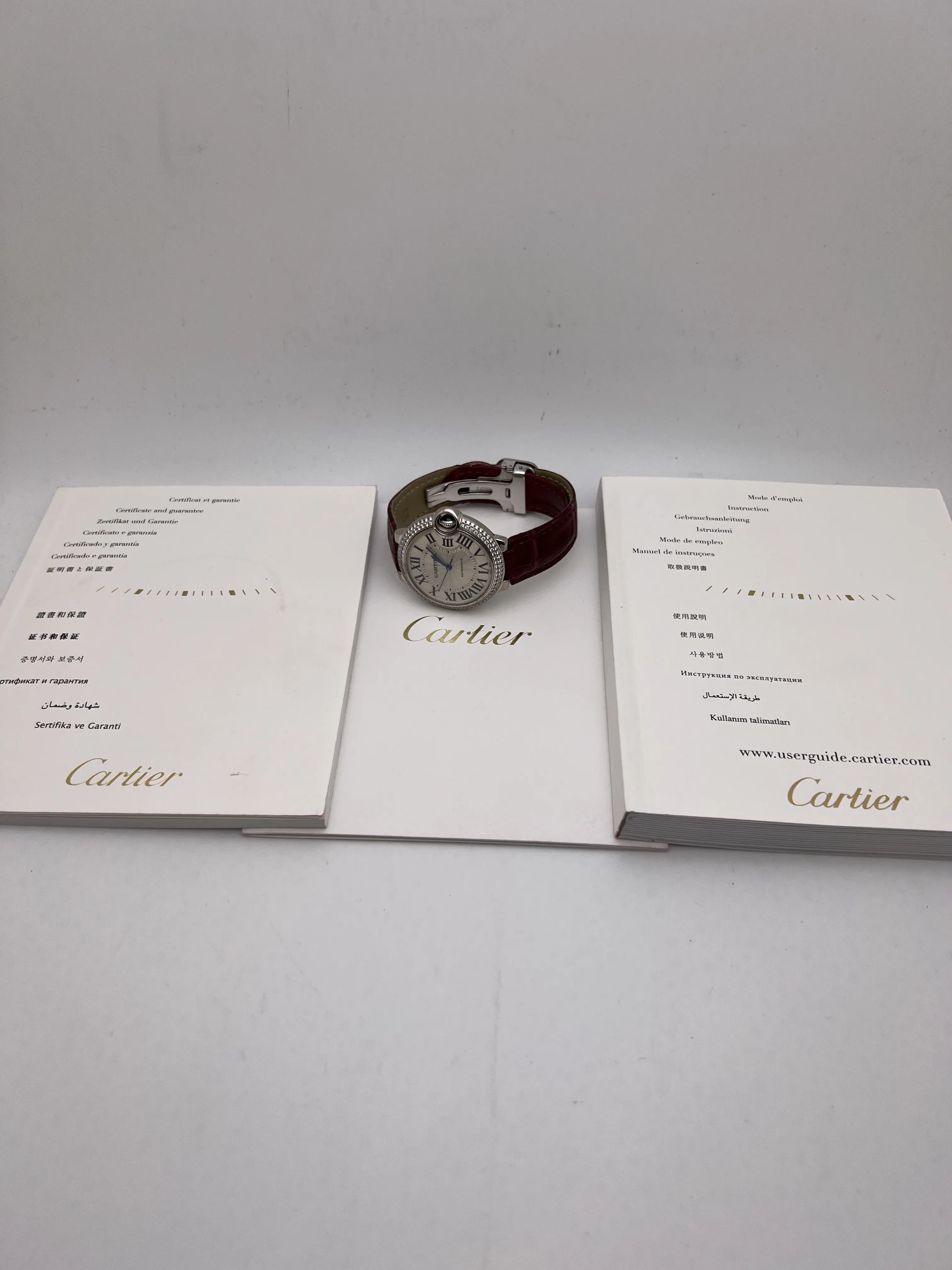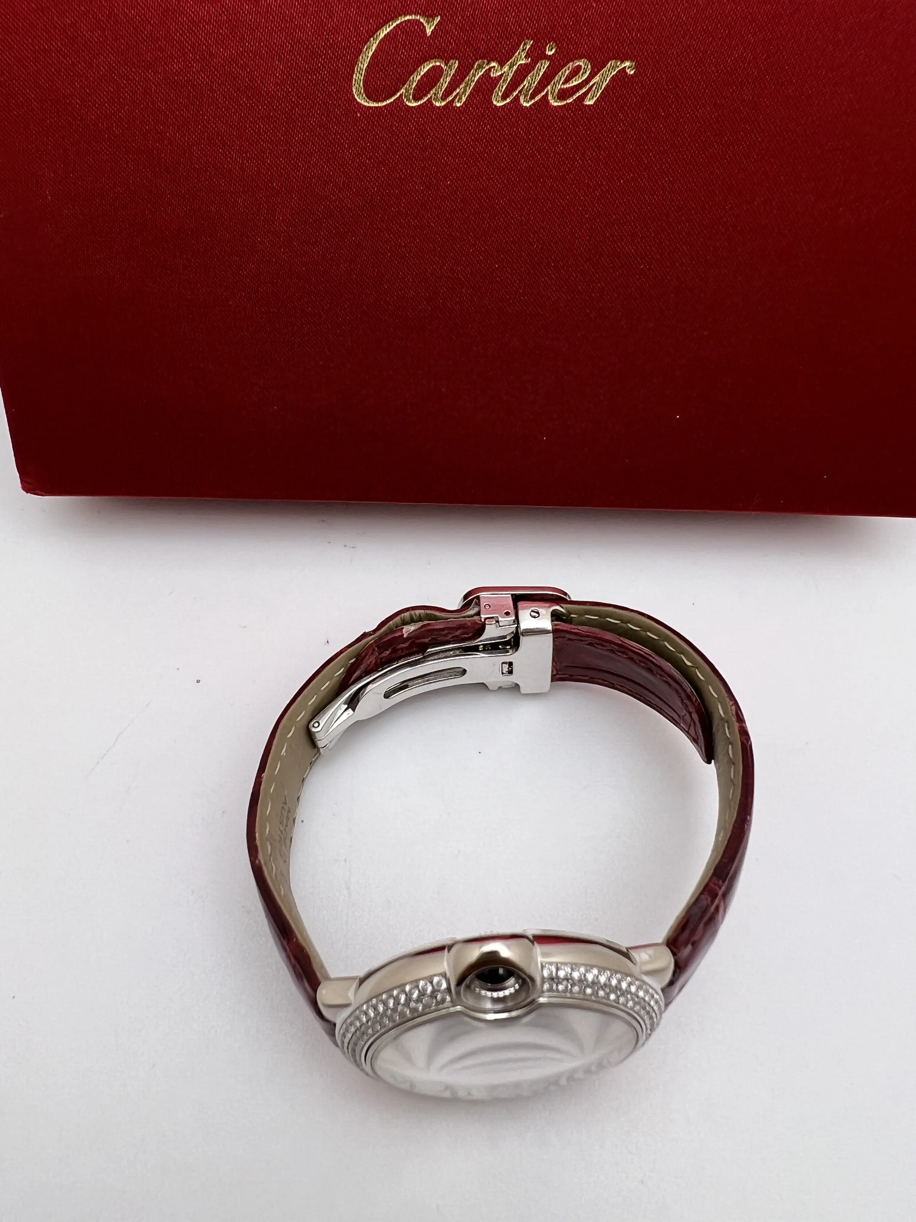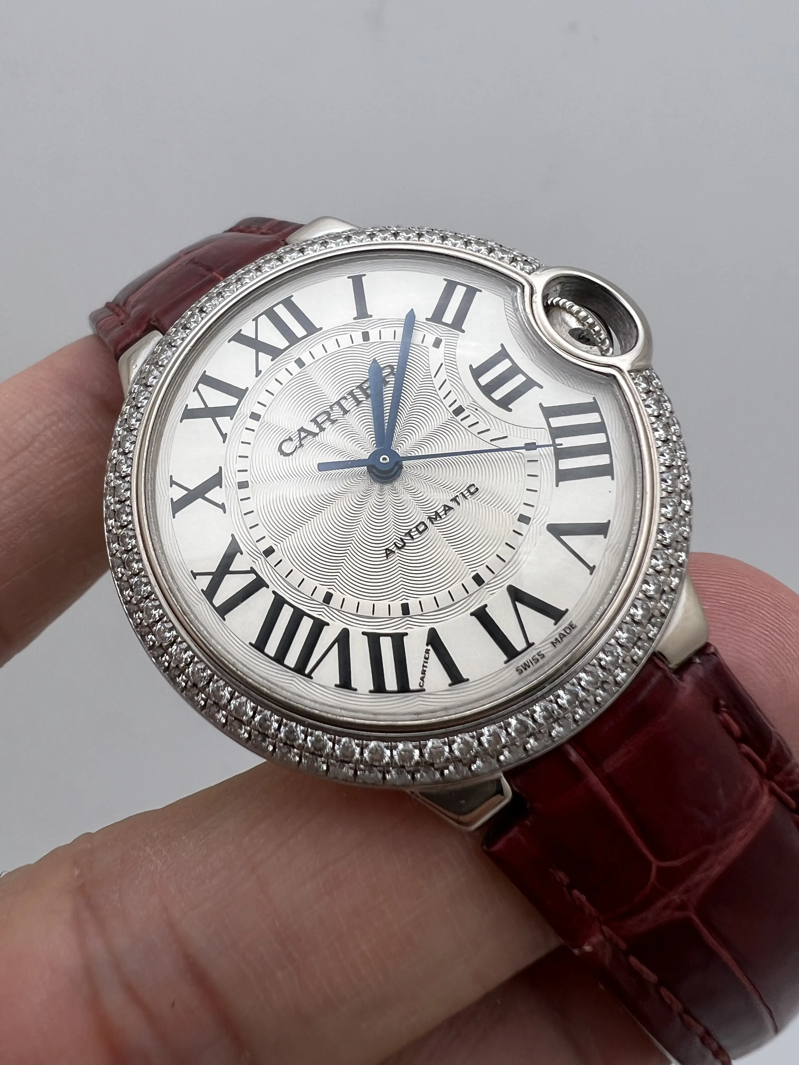 Cartier Ballon Bleu 36mm 18k White Gold Case with Factory Diamond Bezel, featuring the signature guilloche dial with Roman Numeral Markers and date window, blue sword hands and sapphire cabochon set upon the crown, automatic movement, 18K White gold deployant buckle and burgundy alligator leather band. Watch comes complete with Box and Double Guarantee Papers - for both the watch and the diamonds from Cartier. Opportunity to get an incredible watch at a huge discount, factory original just like from the boutique!